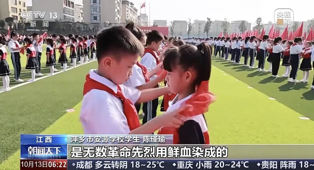 在红领巾的发源地江西萍乡市安源区,红色情景剧《红领巾在这里诞生》上演,少先队员们深情演绎那段光荣历史。新队员在星星火炬旗帜下宣誓,光荣加入少先队。