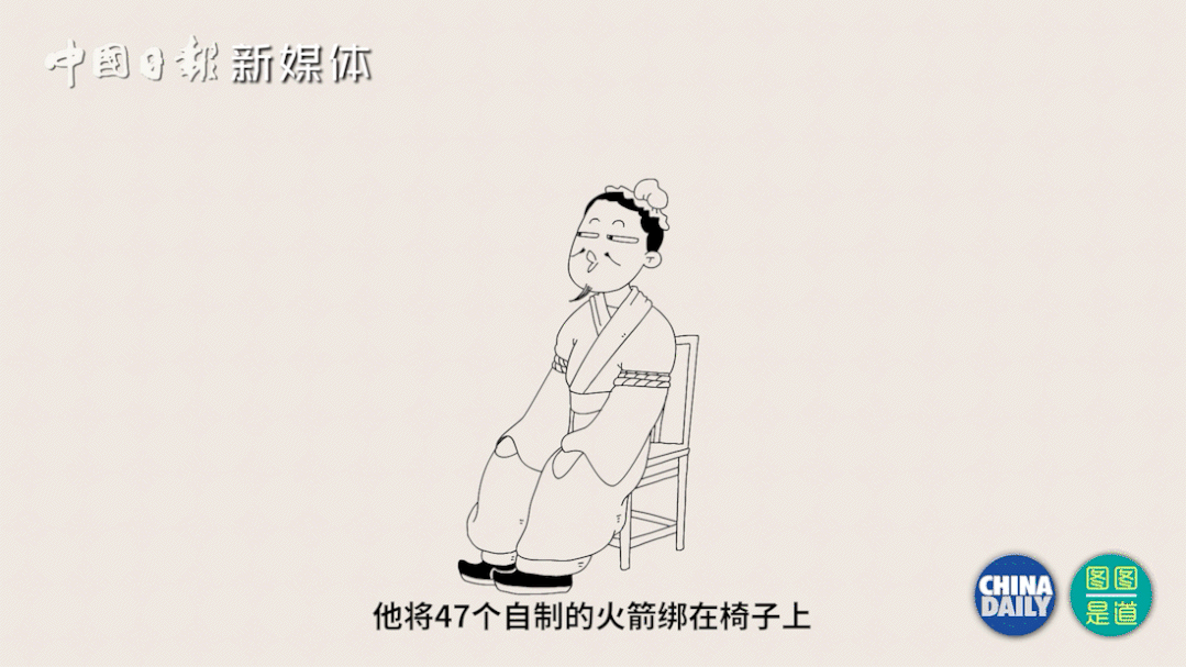 明朝的万户是第一个将“飞天”想法付诸于实践的人。他将47个自制火箭绑在椅子上,手举风筝坐在上面,命人点火发射,企图借助火箭的动力飞起。不幸的是火箭发生爆炸,他不但没有成功,还为此献出了生命。