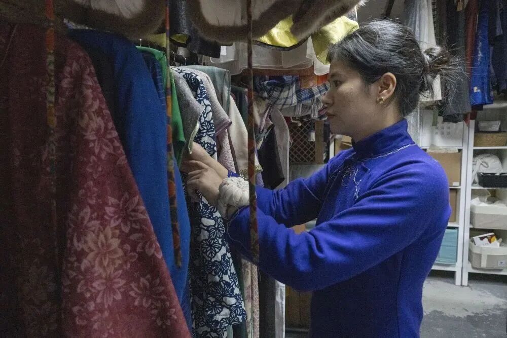 2025年11月13日,在上海川沙古镇,古镇东侧旗袍工作室店主阳慧整理服装。新华社记者董博婷 摄
