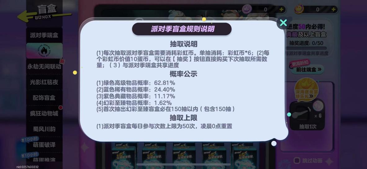 在多款盲盒的抽取界面,显示有“十抽内必得稀有或以上奖励”,而事实上,抽取到最高级别盲盒的概率极低。《蛋仔派对》显示,派对季盲盒的绿色高级物品、蓝色稀有物品、紫色典藏物品、幻彩至臻物品的概率分别为62.81%、24.40%、11.17%、1.62%,首次抽出幻彩至臻盲盒必在150抽以内。而150抽需要9000个蛋币(需人民币近900元)。