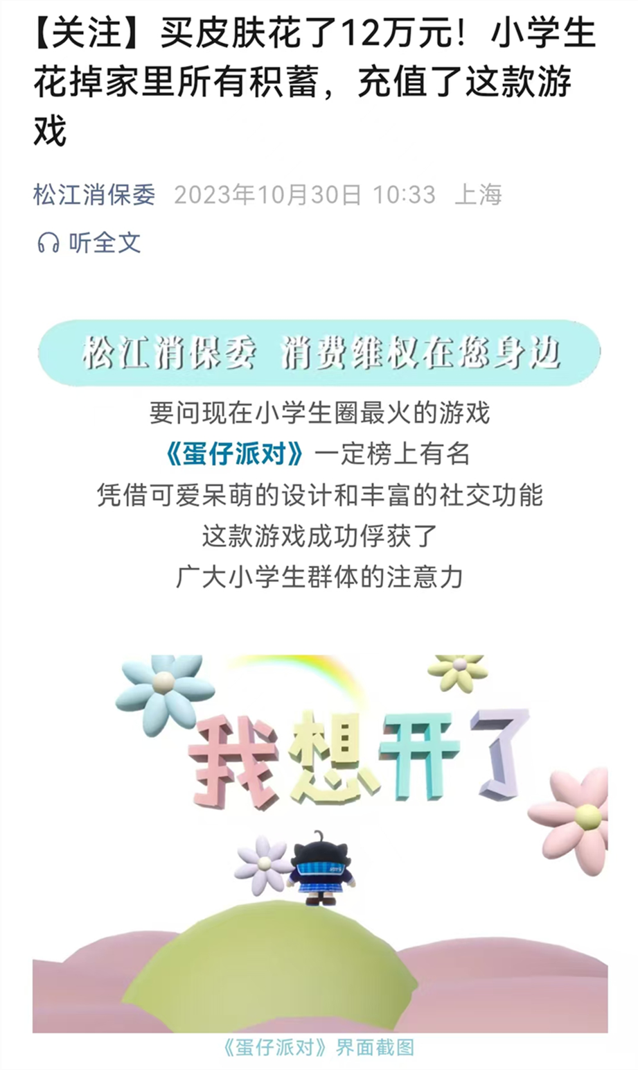 另外还有“9岁女孩玩蛋仔派对消费17万”等未成年人游戏充值案例见诸网络,引发社会各界对这款游戏的担忧。