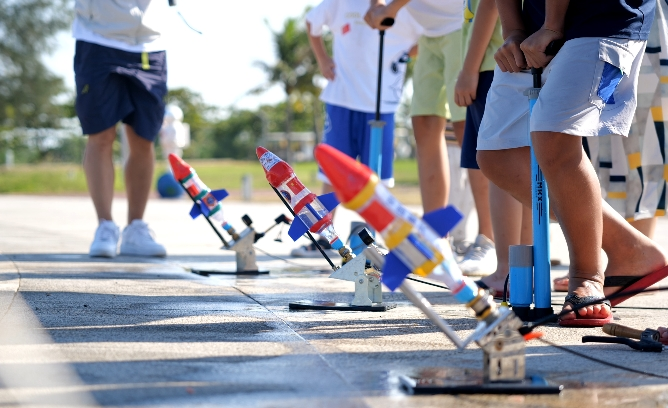 孩子们在教练的指导下放飞水火箭