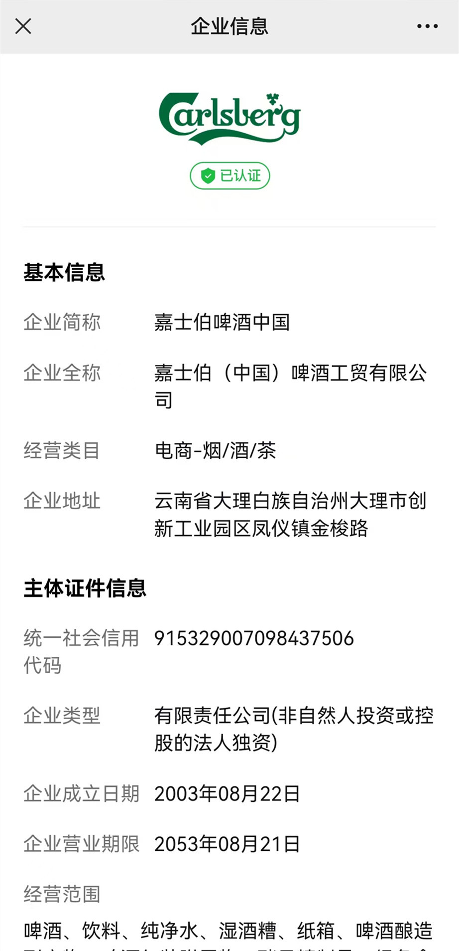 “福利官-酒花儿”嘉士伯啤酒中国企业微信认证信息