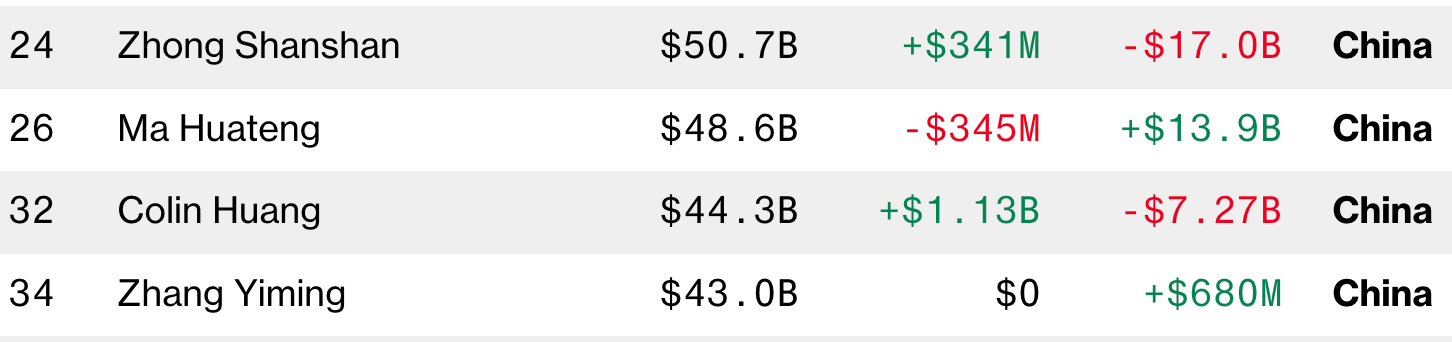 北京时间10月29日上午10时,福布斯实时富豪榜显示,钟睒睒当前的财富值为503亿美元(约合3585.53亿元人民币),马化腾、张一鸣、黄峥紧随其后。彭博亿万富翁指数中国排名最高的,也是钟睒睒,财富值为507亿美元(约3614.91亿元),随后是马化腾、黄峥和张一鸣。