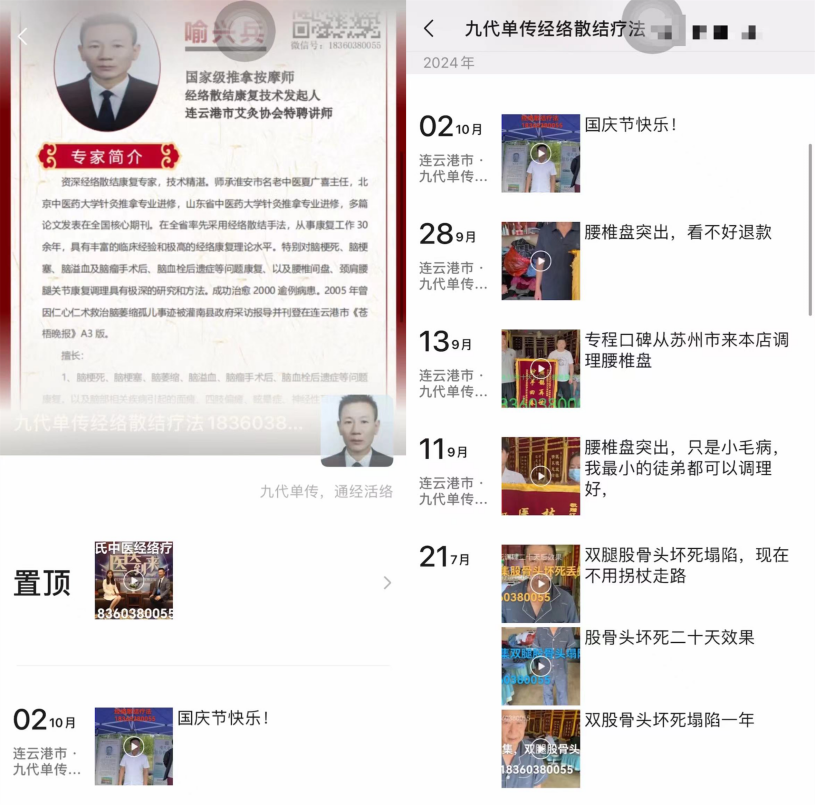 在媒体此前的报道中,喻兴兵的“经络散结疗法”门店位于连云港市灌南县人民中路一侧,门口三块银色牌匾写着“江苏省非物质文化遗产经络疗法”“连云港市非遗喻氏中医经络疗法”“连云港市喻氏经络调理有限公司”。