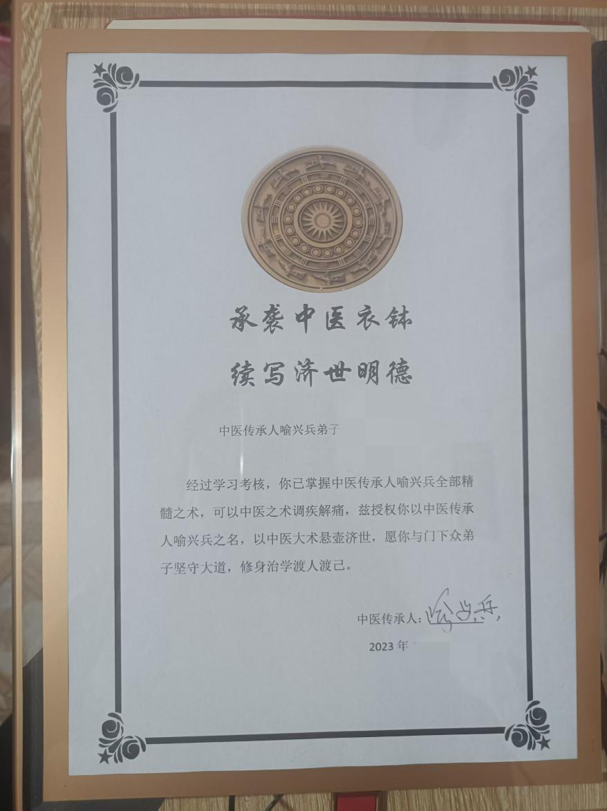 喻兴兵向“弟子们”颁发的自制“师承证书”(受访者供图)
