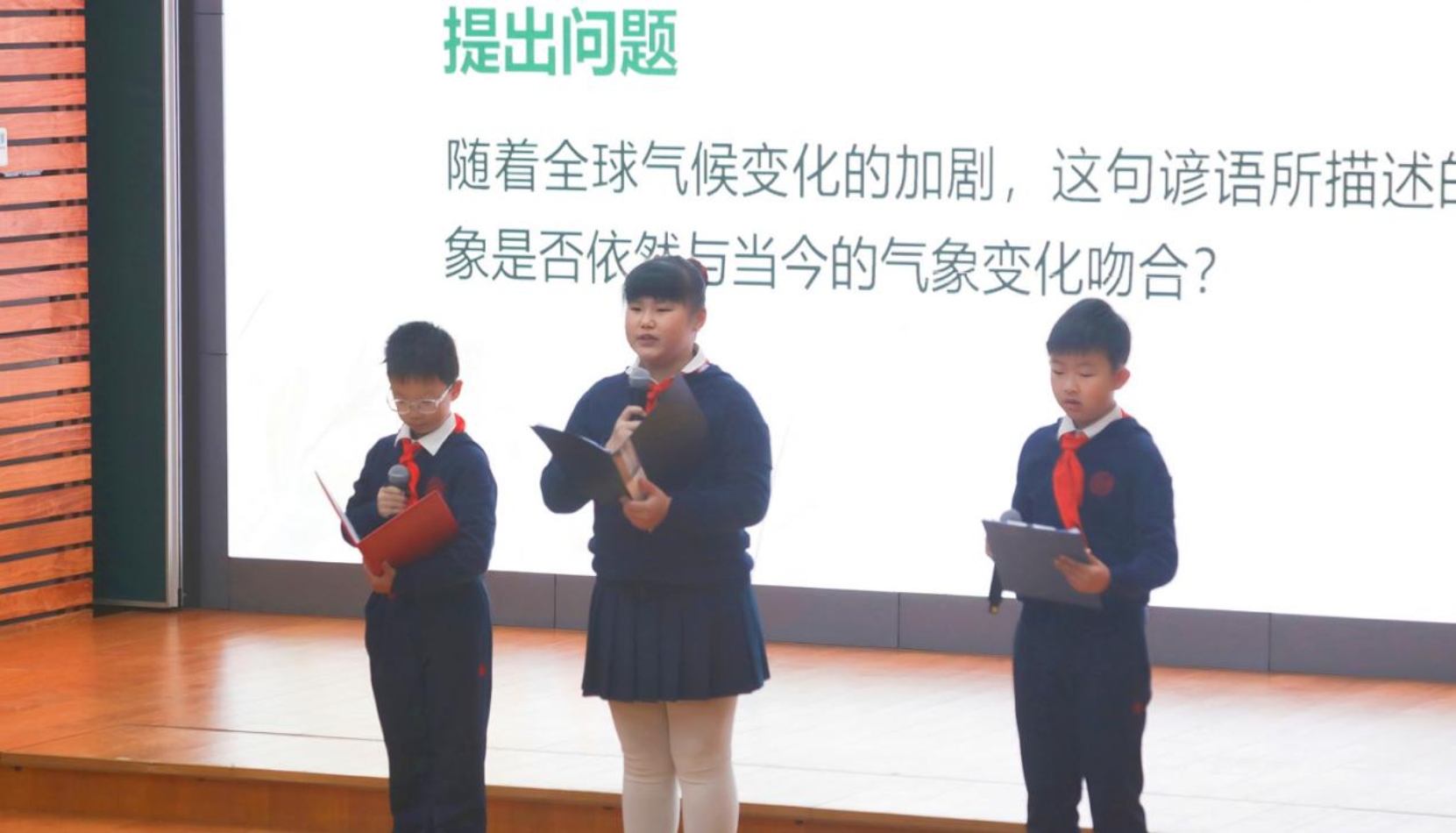 同学们正在汇报来广营地区秋雨与气温变化