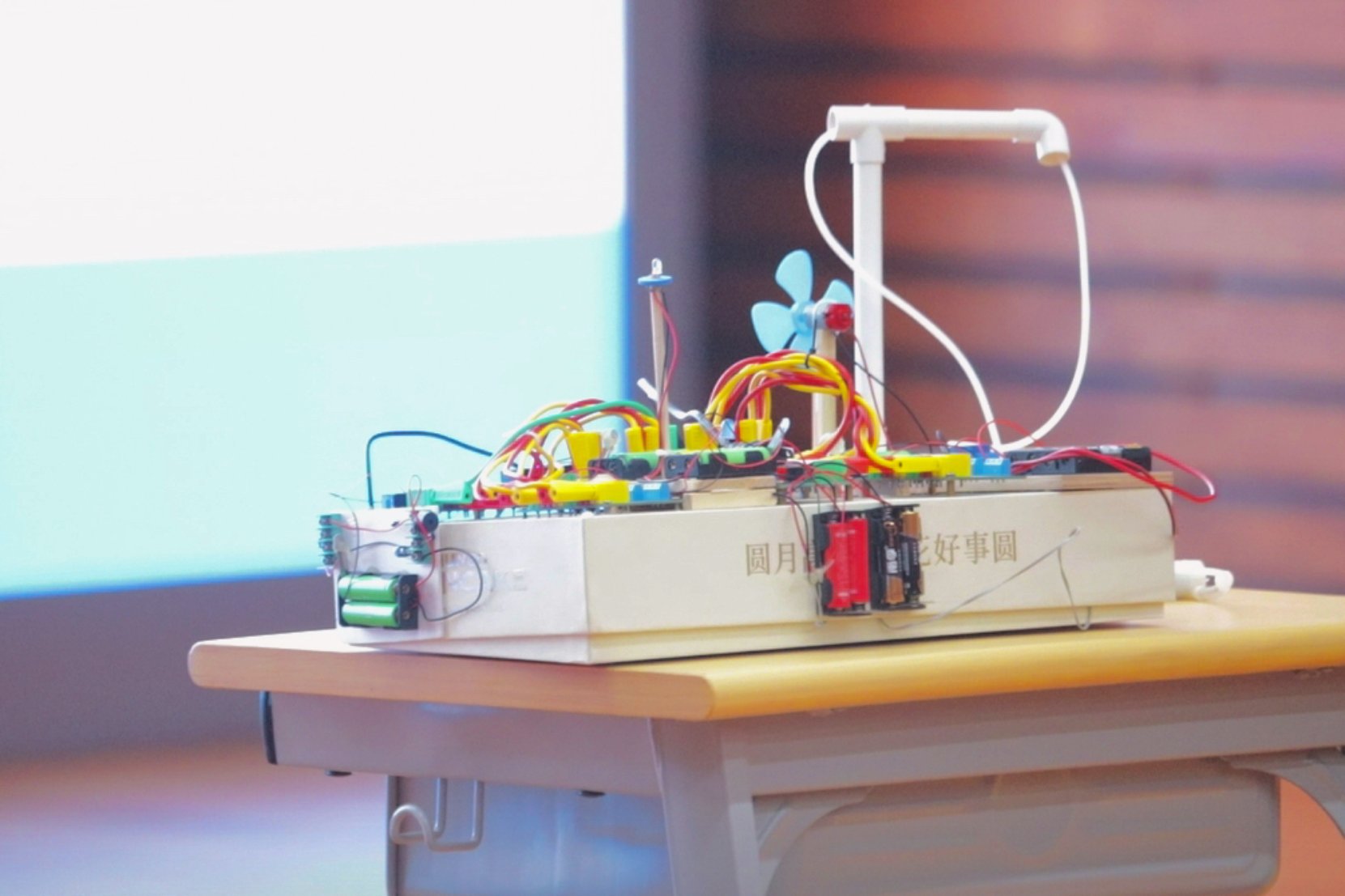 在活动现场,一个精心研发的系统模型吸引了在场同学的注意力,一个个精细的配件有序组合,构成了一个充满科技感与人文关怀的智能家居系统。这是北京市第二中学经开区学校科技社团的代方旭同学,通过日常细致观察到爷爷、奶奶的实际需求,尝试制作了一套“适合老年人”的智能系统“未来家庭音控智能家居系统”。从语音识别模块到控制电路,从传感器到执行器,每一个部件都体现了他对技术的熟练掌握和对细节的严格把控。通过先进的语音识别技术,用户只需简单地发出语音指令,就能轻松实现开关门窗、控制水电、操作家电、智能浇花以及自动报警等一系列操作。这个模型不仅仅是一个技术展示,更是他成熟智能家居想法的具体呈现,展示了他如何将 AI 技术与家庭生活场景紧密结合,创造出一个便捷、安全、舒适的居住环境。