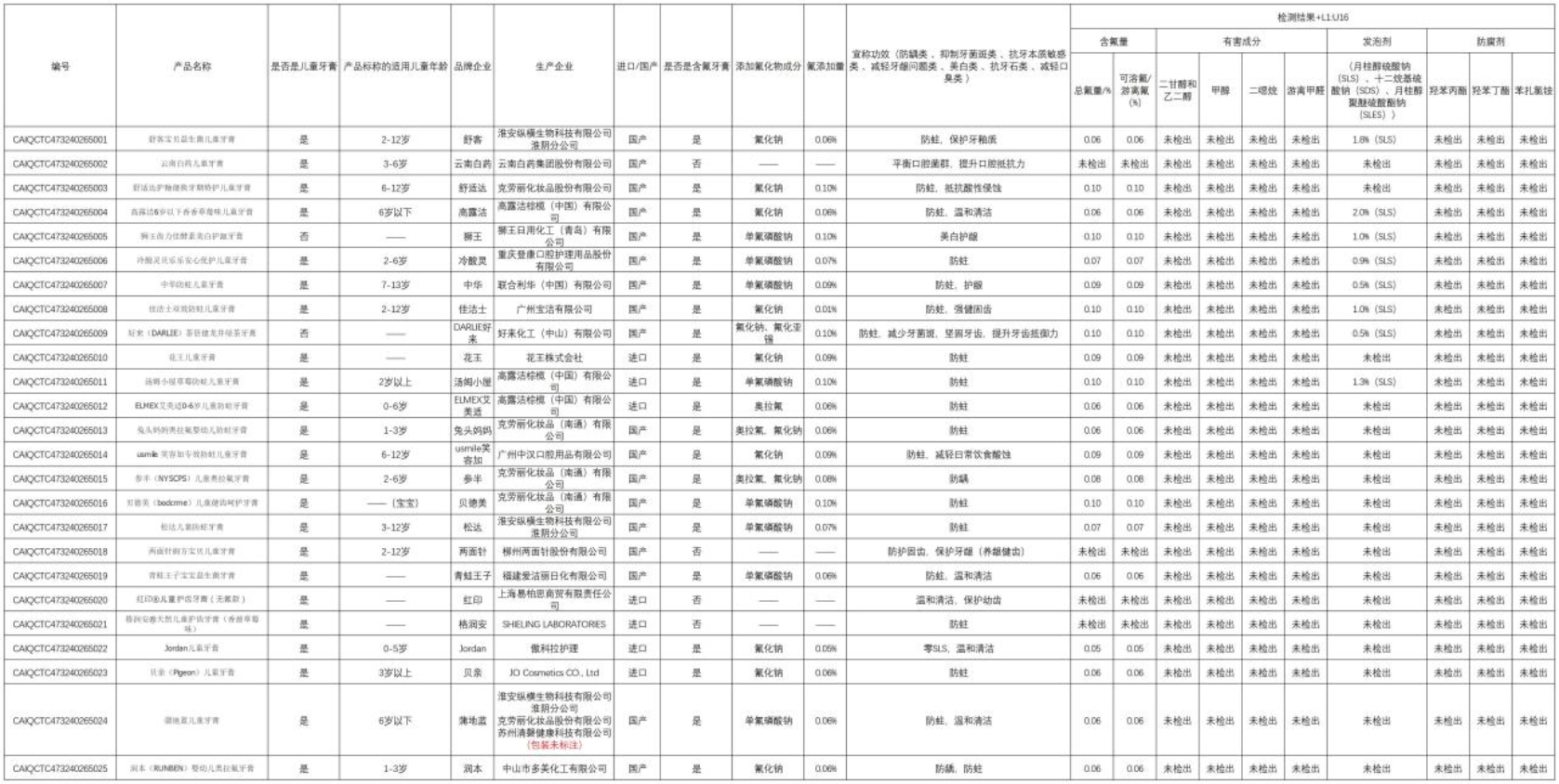儿童牙膏市场乱象已引起相关部门重视。近日,中国消费者协会于2024年下半年对市场上销售的25款儿童牙膏产品进行了比较试验。这些样品分别从物美超市、首航超市、京东、淘宝、快手、抖音、拼多多等线上线下渠道购买,并由中国检验检疫科学研究院化妆品技术中心对含氟量、有害成分、发泡剂、防腐剂进行了测试。