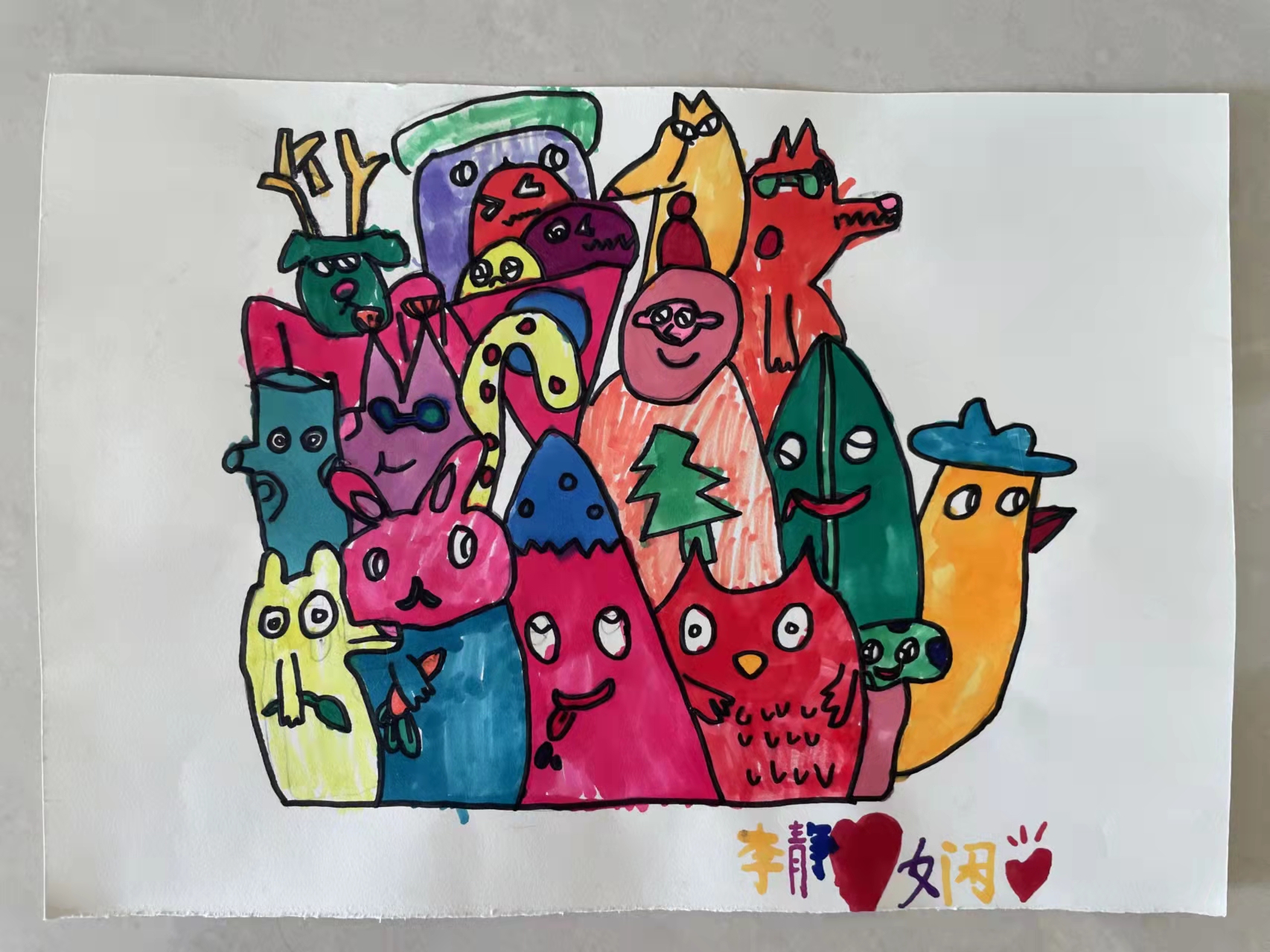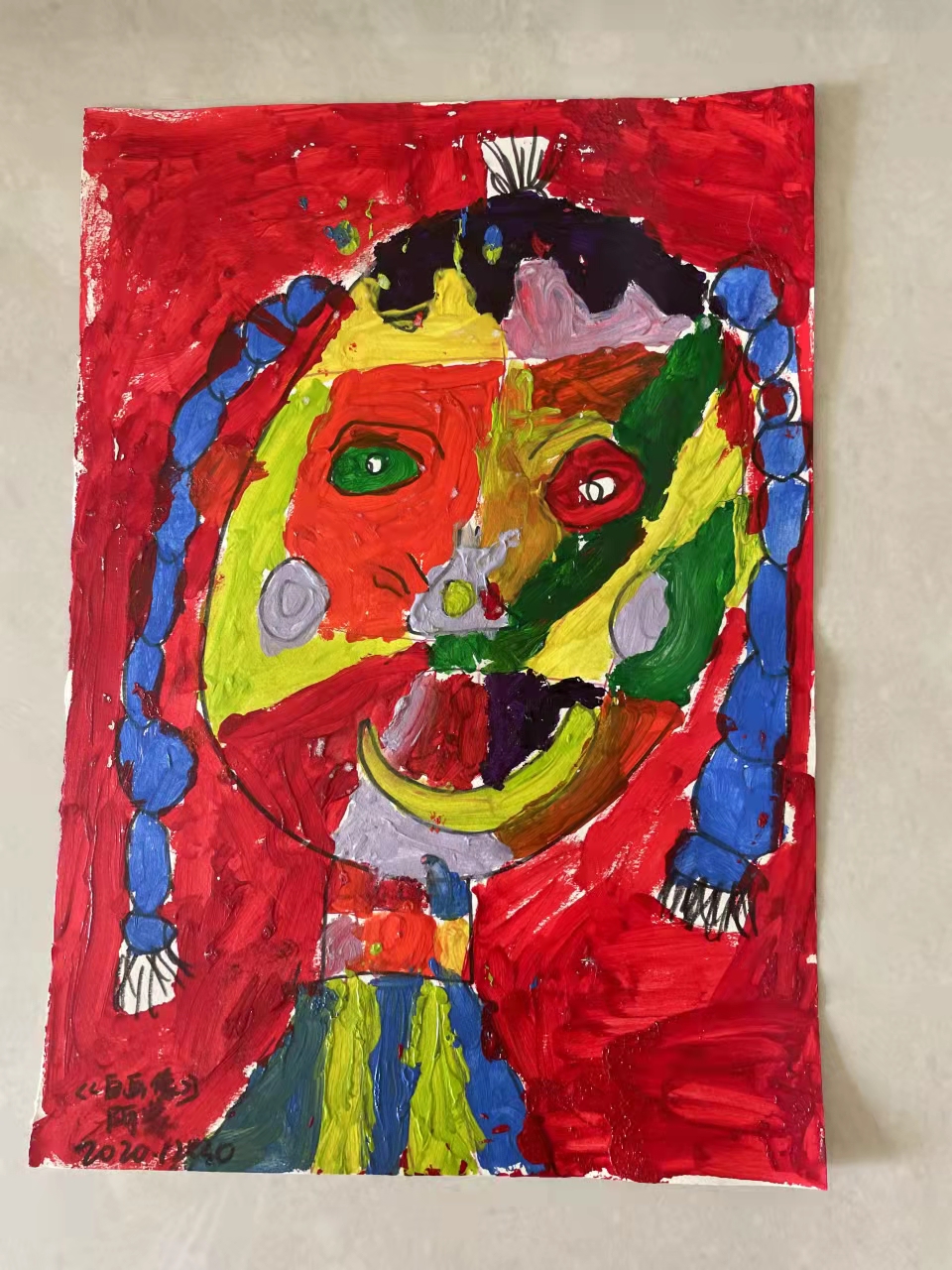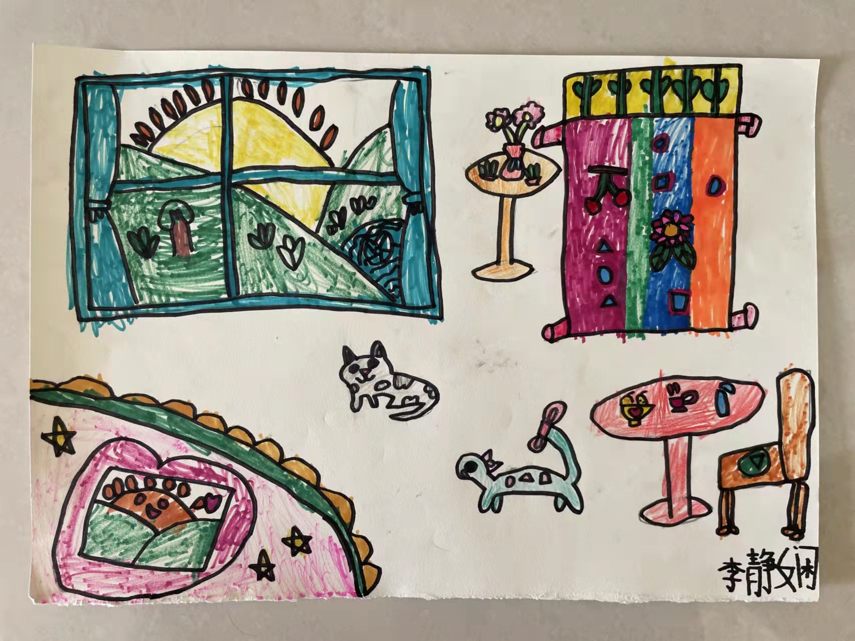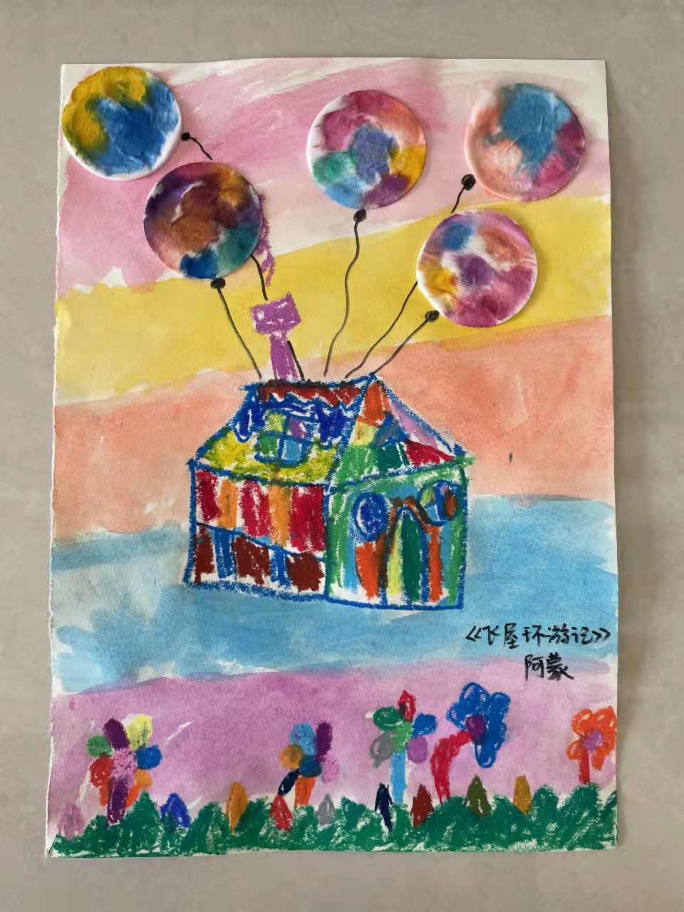作品映照了一个7岁女孩眼里的世界与心中的追求:窗外的鸟、水中的鱼、家里慵懒的猫咪,脑海憧憬的奔马、飞翔的小屋、五彩斑斓的少女,以及作为偶像的“大师”……