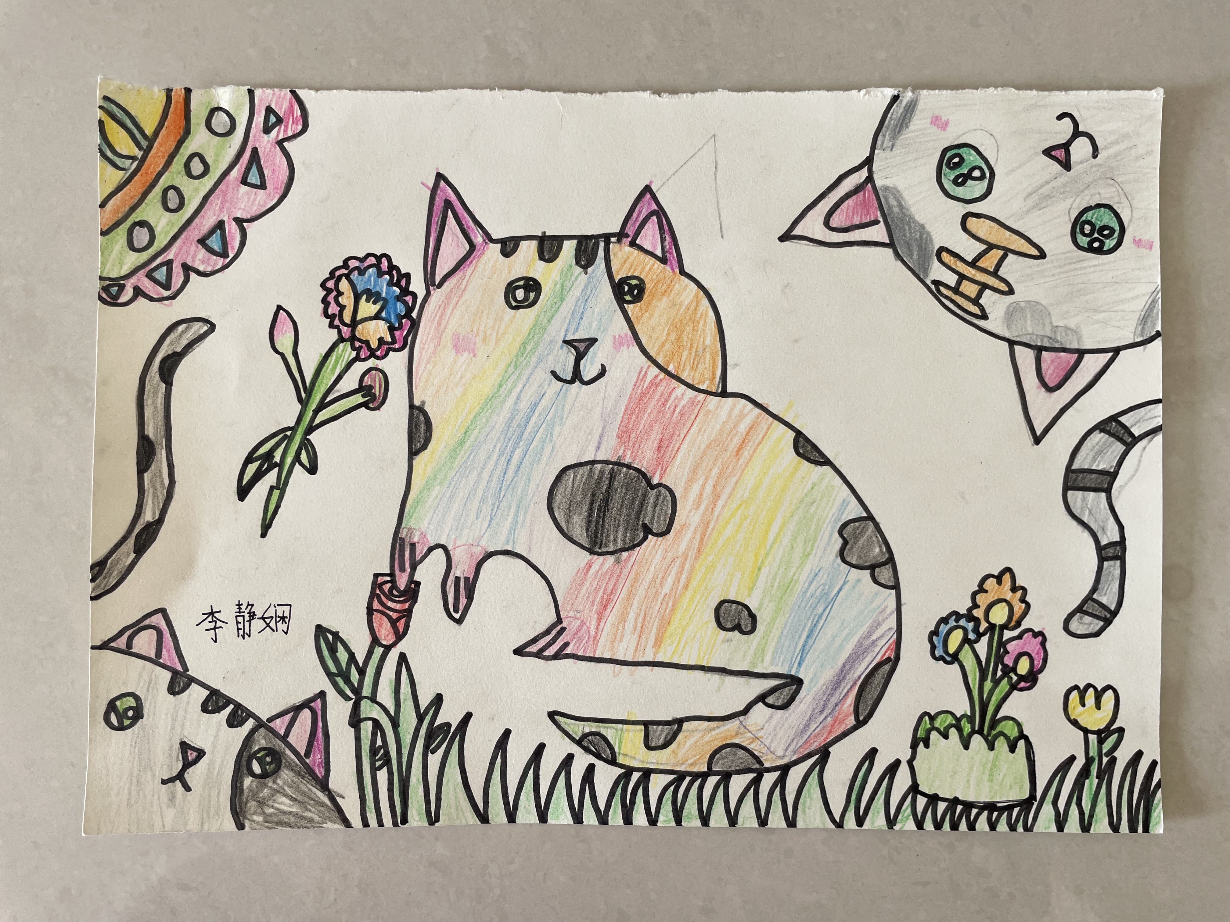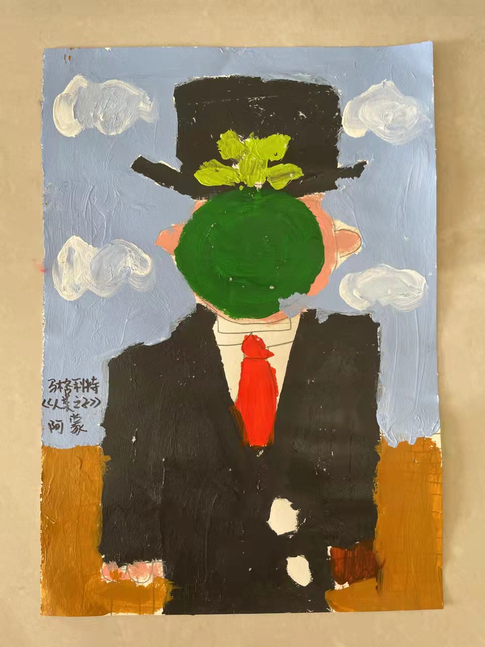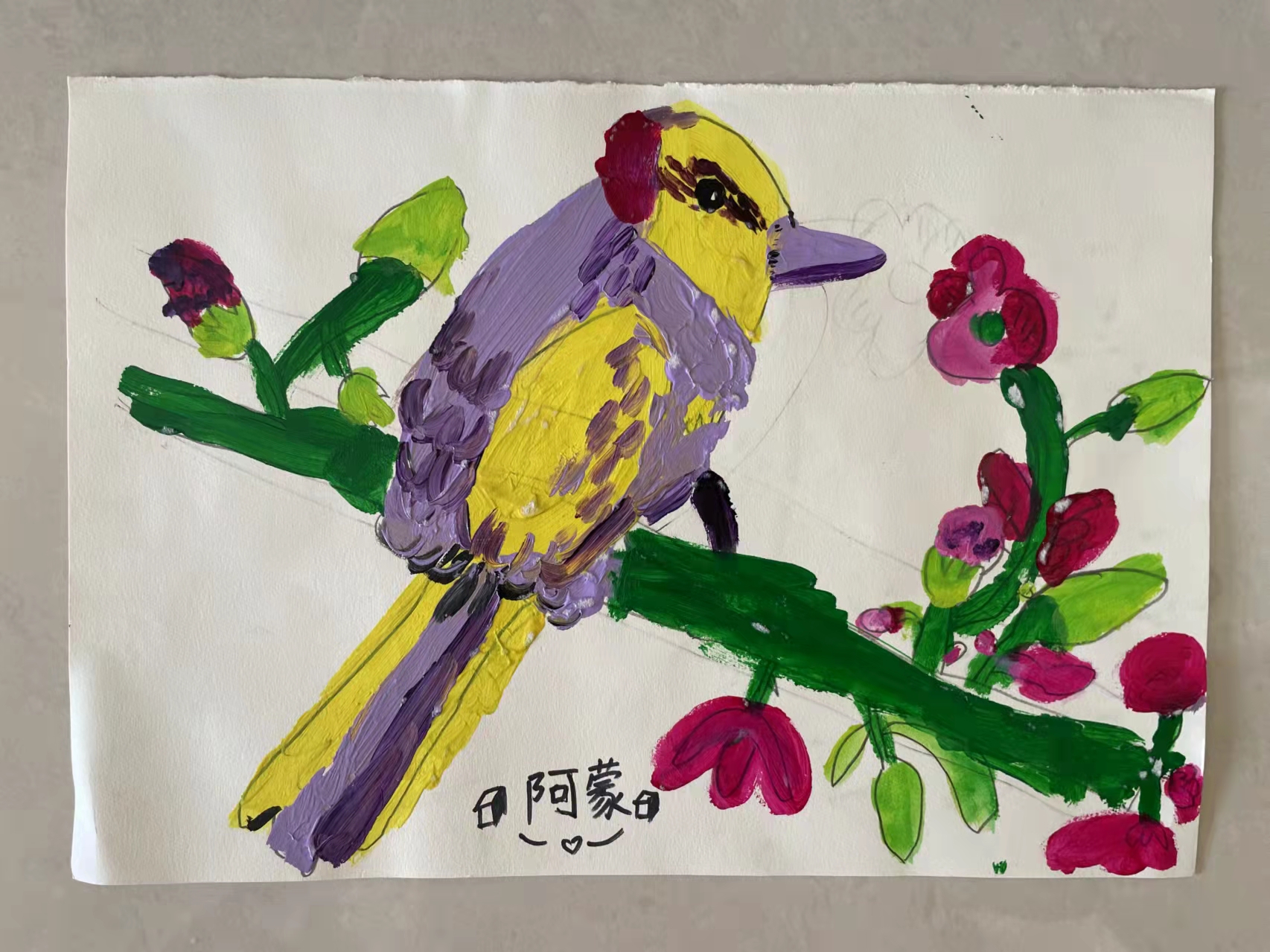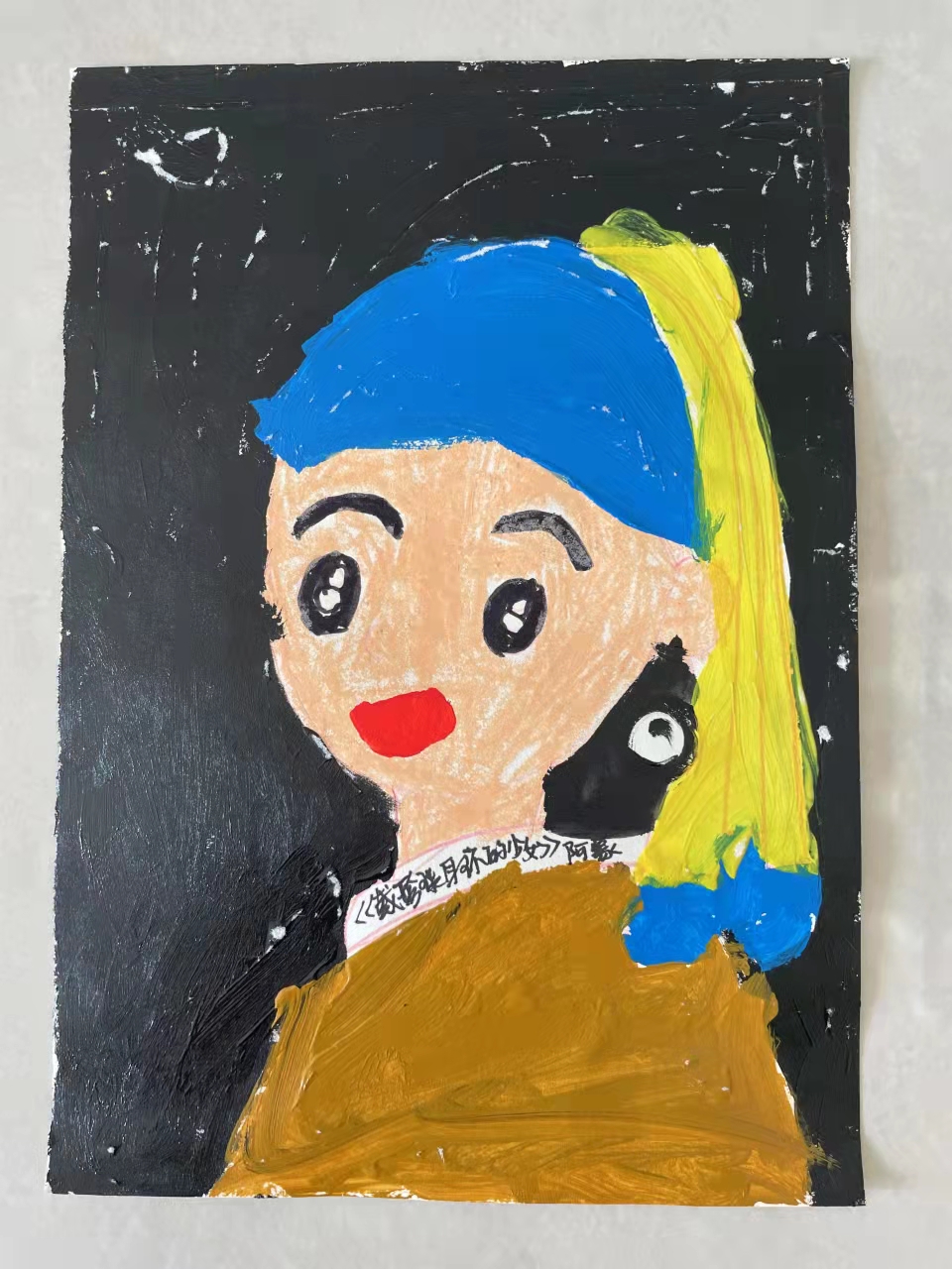 作品映照了一个7岁女孩眼里的世界与心中的追求:窗外的鸟、水中的鱼、家里慵懒的猫咪,脑海憧憬的奔马、飞翔的小屋、五彩斑斓的少女,以及作为偶像的“大师”……