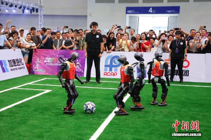 本次机器人足球赛采用3V3和5V5两种赛制,比拼的是机器人的运动控制、视觉感知、定位导航、决策规划等技术。这些人形机器人根据编程设定不同的进攻和防守策略,在场上随机应变。