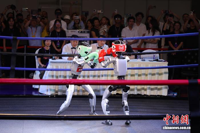 比赛场地另一边,两台人形机器人在擂台上相对而立,进行自由搏击表演赛。挥拳、踢腿、闪避……两台人形机器人走位灵活,一方突然进攻,另一方巧妙闪避。