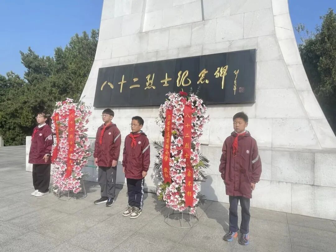 庄严的纪念仪式在纪念碑前拉开帷幕。五(2)中队的谢卓依、高英然等四位队员代表共同向革命烈士敬献花篮,全体队员垂首默哀,深切缅怀英烈。随后,全体队员以中队为单位,缓缓绕纪念碑一周。阳光洒在洁白的雕塑上,烈士们的战斗姿态清晰可见,同学们步伐轻缓、神情肃穆,用静默的环绕,传递着对八十二位英烈最真切的追念与敬意。大队委羊诗晗带领全体队员重温入队誓词,清脆的童声中满是传承使命的坚定。