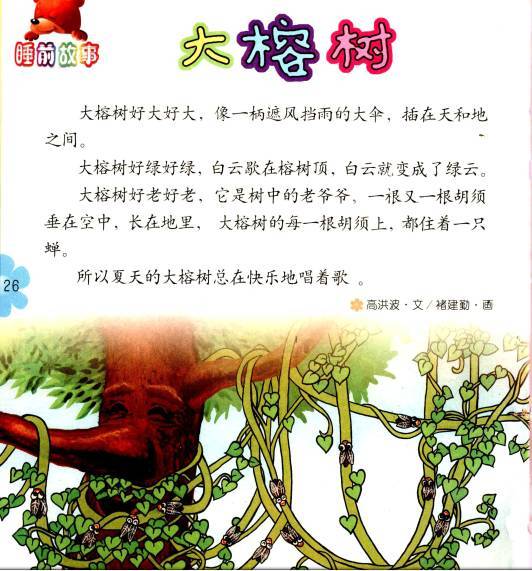 大榕树好老好老,它是树中的老爷爷,一根又一根胡须垂在空中,长在地里,大榕树的每一根胡须上,都住着一只蝉。