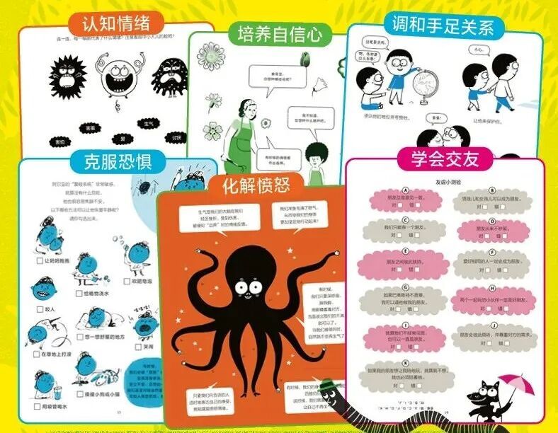 《我的情绪》教会孩子识别7种基本情绪,当孩子能说出“我不是‘不听话’,我只是‘感到委屈’”时,便已迈出了心理自助的第一步;《我的自信心》让孩子看见自己的闪光点,在“我能行”的积极暗示中摆脱贴标签,不断强化自我认同;《我的朋友》帮助孩子主动表达友好、化解社交矛盾,在同伴关系中建立安全感;《我害怕了》让孩子把抽象的恐惧具象化,逐步建立面对未知的勇气;《我生气了》引导孩子从 “哭闹发泄” 转向 “合理表达”,学会与愤怒和平共处;《我的兄弟姐妹》让孩子学会看见彼此的优点,从“争夺关注” 转向“互助分享”,在家庭互动中培养包容与协作的品质。