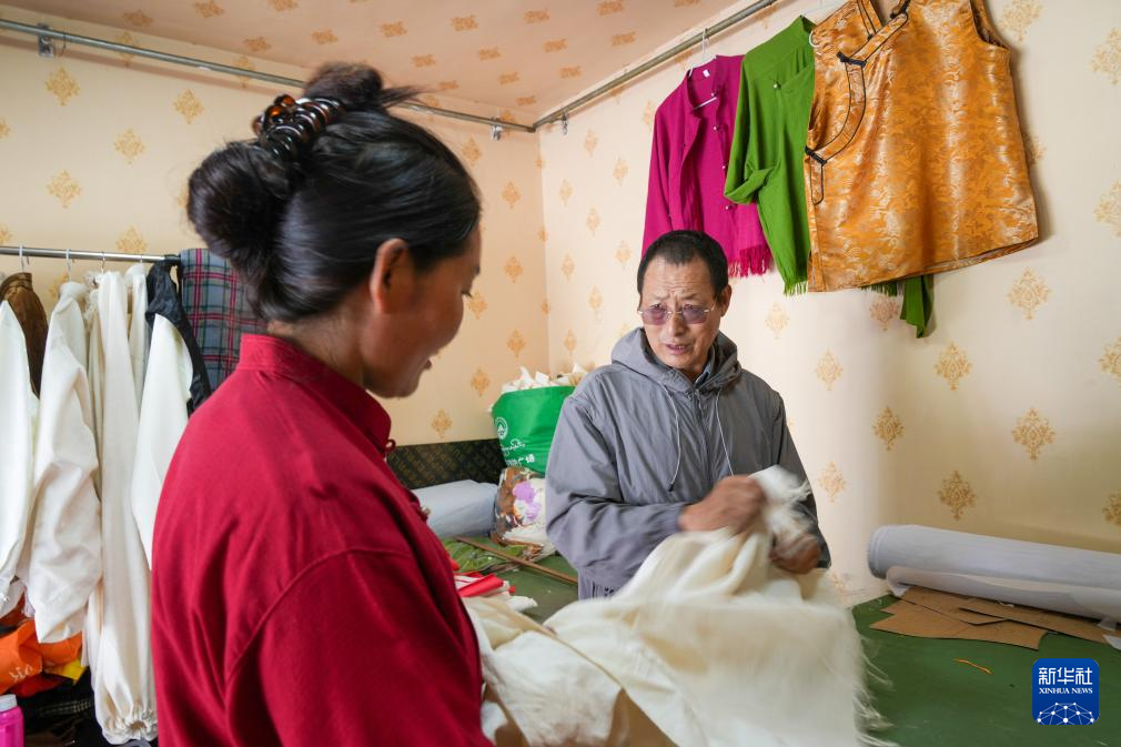 洛桑麦朗来到毕业学生开设的店铺,现场示范制衣过程中的细节(8月15日摄)。
