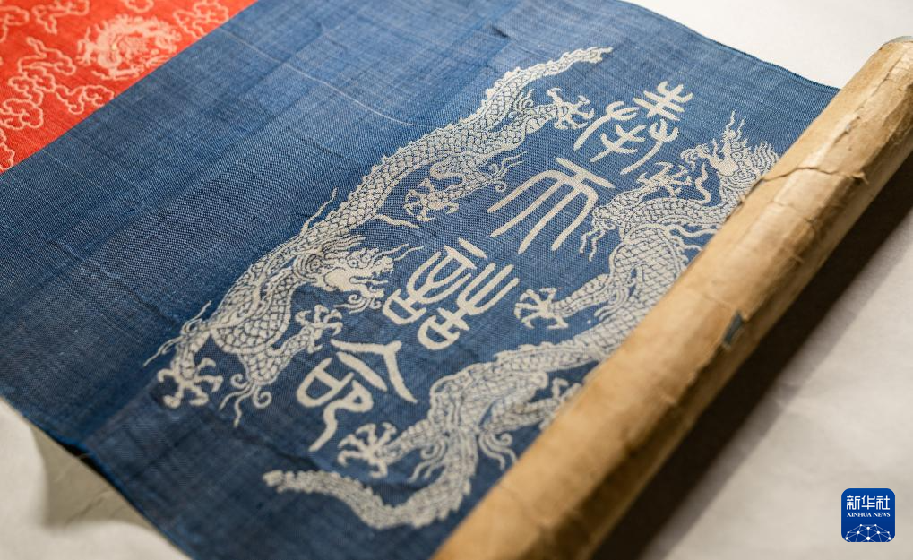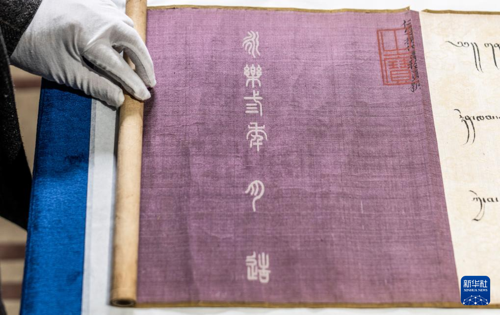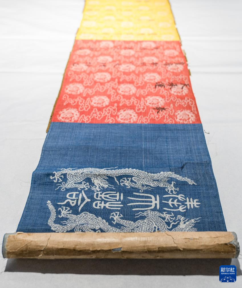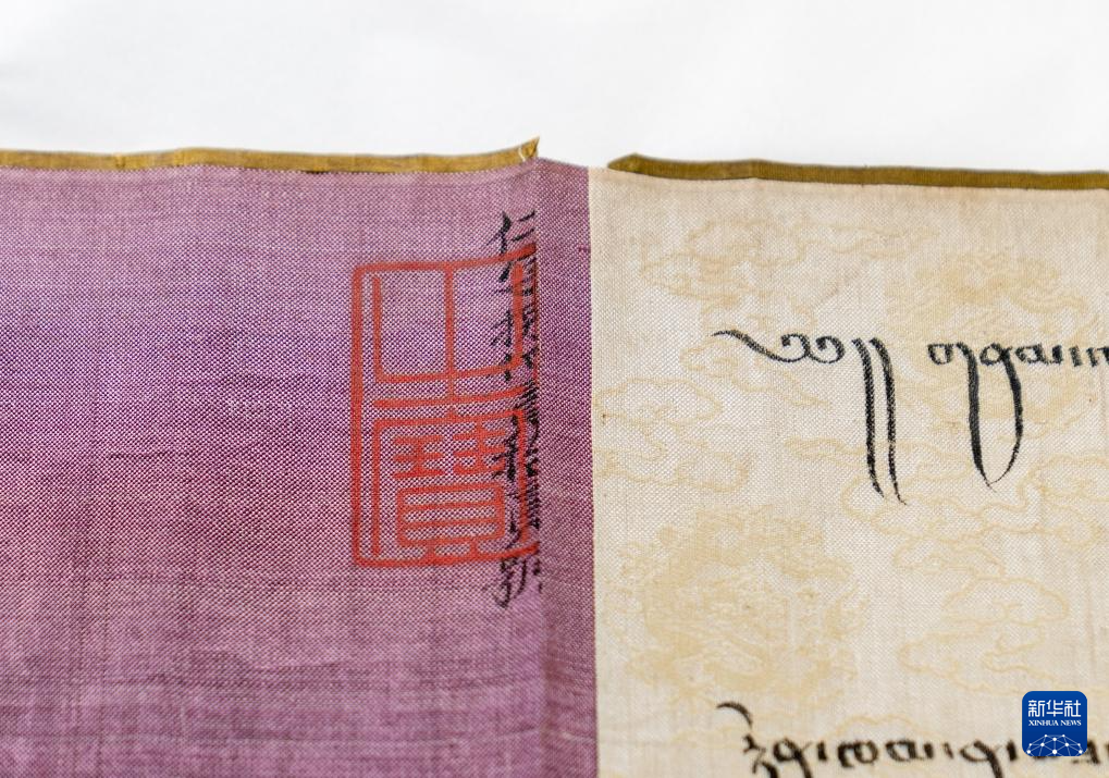这是《永乐十一年封斡喃渴烈思巴为辅教王诰书》卷首(5月20日摄)。篆书“奉天诰命”四个字和双龙图案均是锦缎织造时应用提花技术以不同色彩的丝线织成。新华社记者李贺 摄