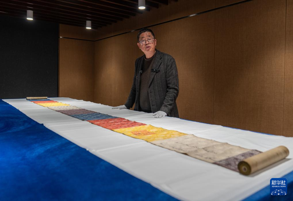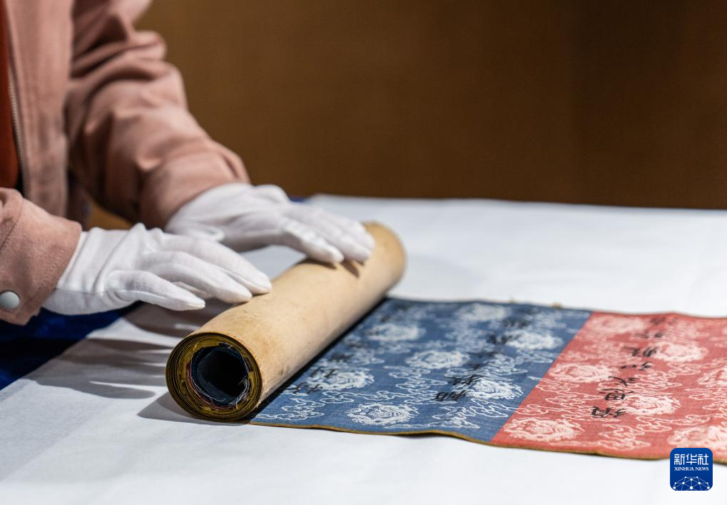 西藏博物馆工作人员将《永乐十一年封斡喃渴烈思巴为辅教王诰书》徐徐展开。新华社记者旦增尼玛曲珠 摄