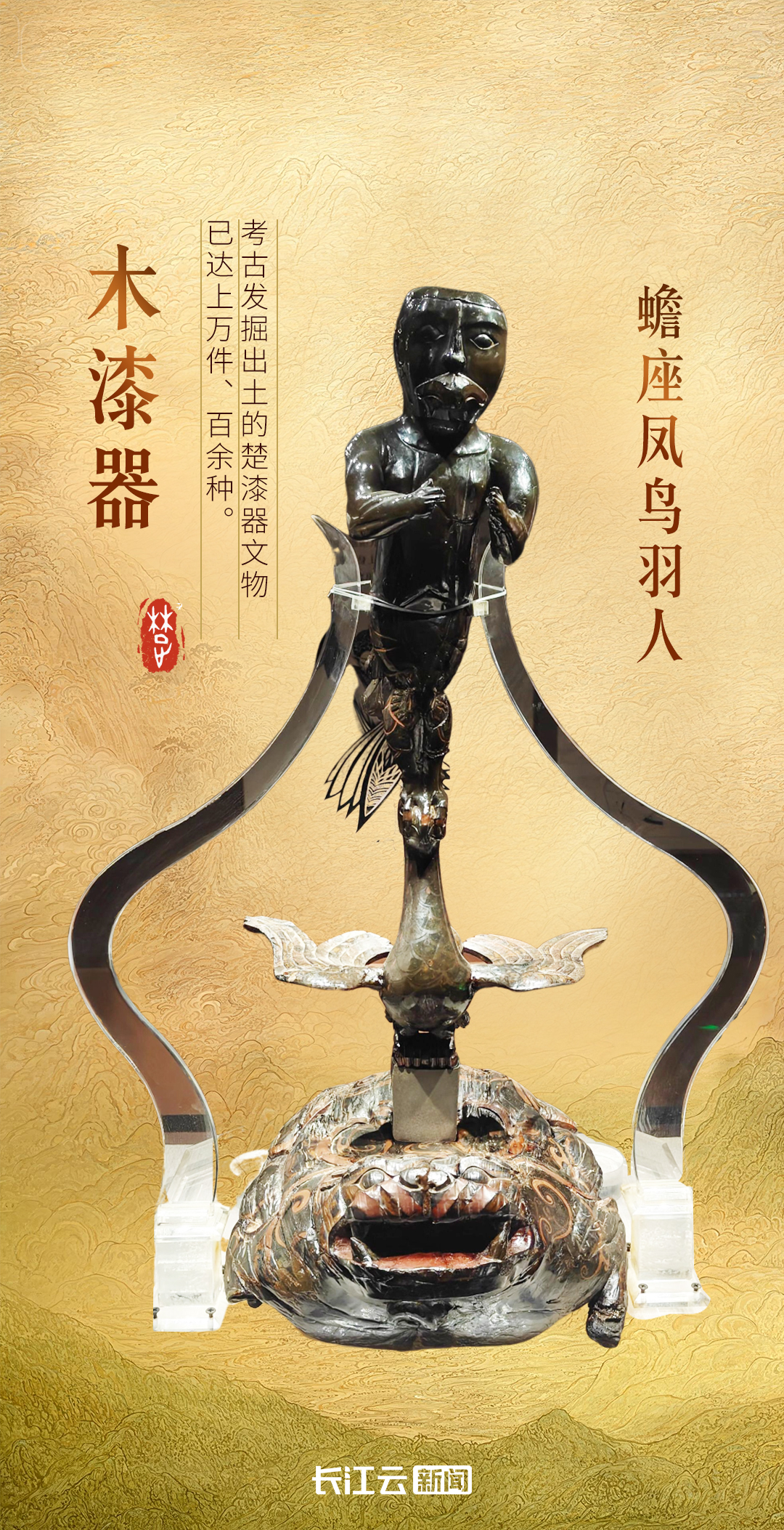 蟾蜍为基,象征月之精华;凤鸟展翅,是沟通天地的神使;顶部的羽人,人鸟合体,则是楚人理想中超越生死、羽化登仙的形态,寄托楚人生命永恒,遨游九天的愿望。