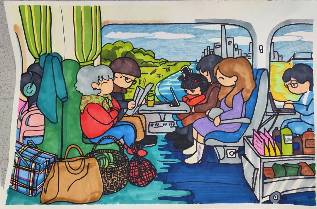 回到家,我迫不及待地把今天的冒险画在了新买的素描本上:会跳舞的油菜花、打喷嚏的大山、对我眨眼睛的老车站......晚上,我做了一个甜甜的梦,梦见我的小床变成了一列彩色火车,“咔嚓咔嚓”地带着我继续在祖国的故事书里旅行。在梦里,我还听到妈妈说:“宝贝,下次我们坐高铁去看雪山好不好?”