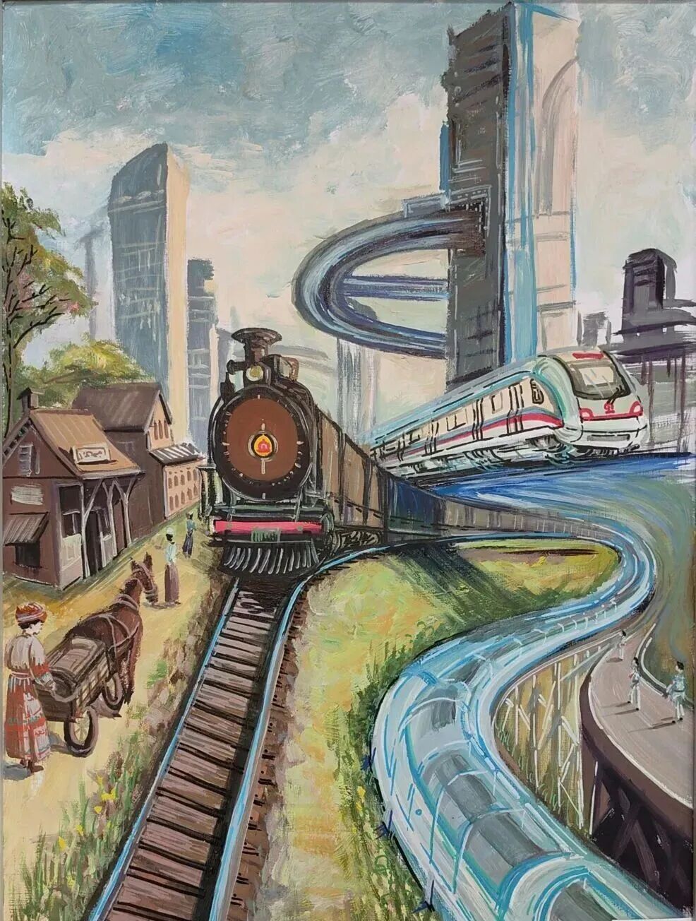 我是在边陲小城——东宁的姥姥家长大的,回佳木斯的爷爷家就要汽车转火车。小时候妈妈带我坐火车的记忆犹如潺潺的溪流在我的心间蜿蜒伸长。绿皮火车“哐当哐当”,是我童年旅程的独特配乐。车窗外,东北大地像打翻的颜料盘。春日,刚抽芽的柳枝在风里荡秋千,和火车玩着捉迷藏;盛夏,大片金黄麦浪涌起,似给大地铺了绒毯,火车驶过,麦浪分开又合拢,像在给铁轨行注目礼;深秋,五花山打翻调色盘,红的枫、黄的杨、褐的柞,在车窗上流淌成画;寒冬,银装素裹的世界里,铁轨是条黑色的琴弦,火车轮与铁轨撞击,似在弹奏冰天雪地的歌谣。