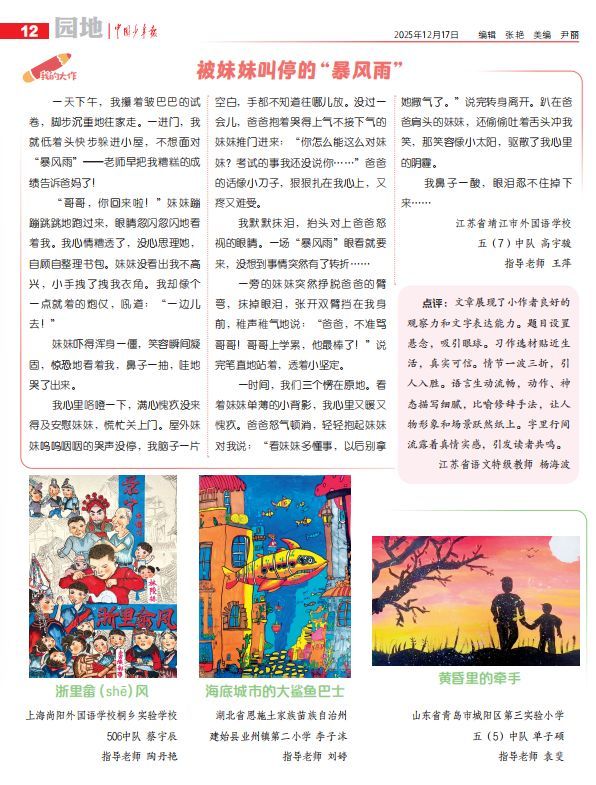 点评:文章展现了小作者良好的观察力和文字表达能力。题目设置悬念,吸引眼球。习作选材贴近生活,真实可信。情节一波三折,引人入胜。语言生动流畅,动作、神态描写细腻,比喻修辞手法,让人物形象和场景跃然纸上。字里行间流露着真情实感,引发读者共鸣。