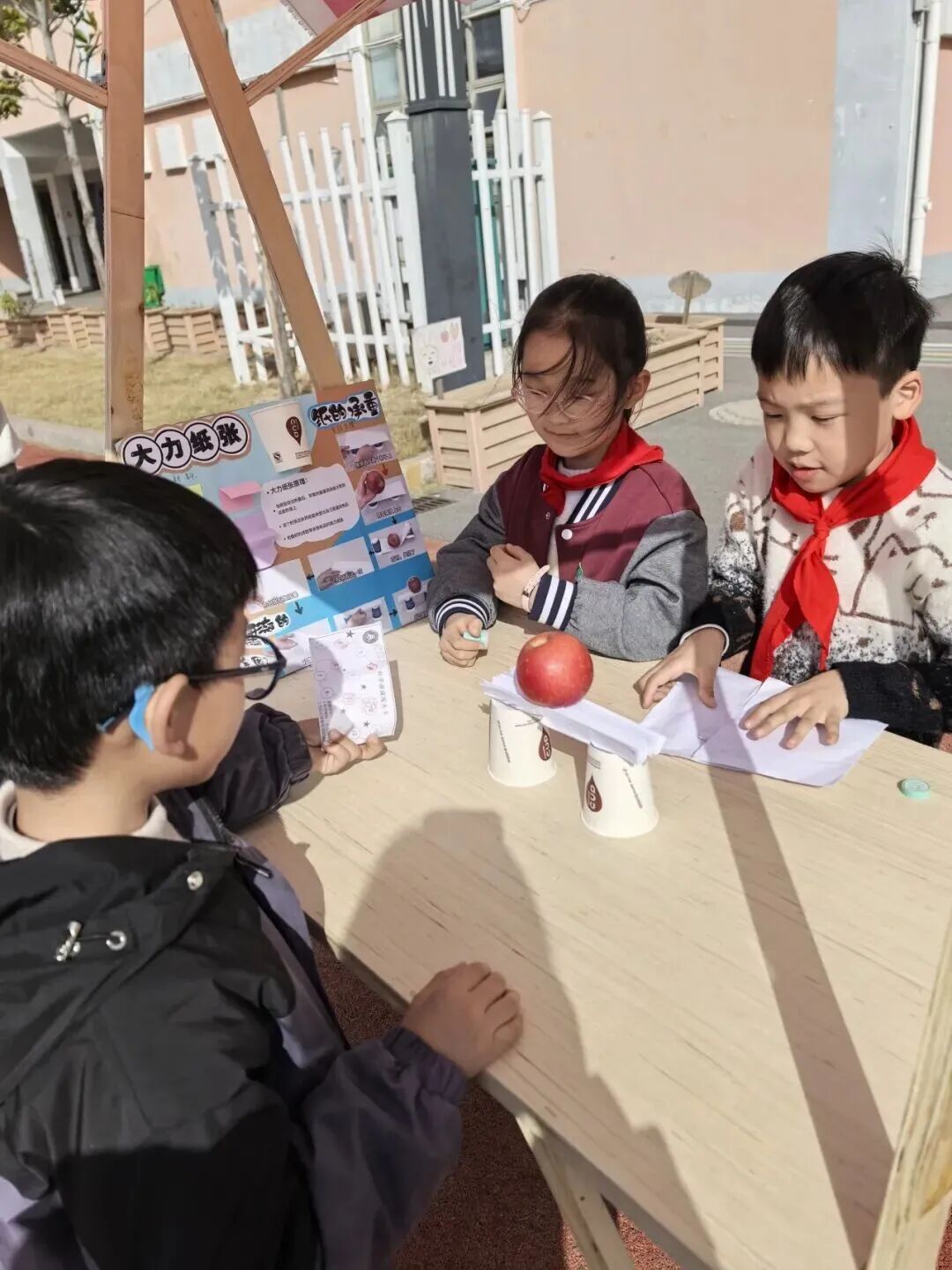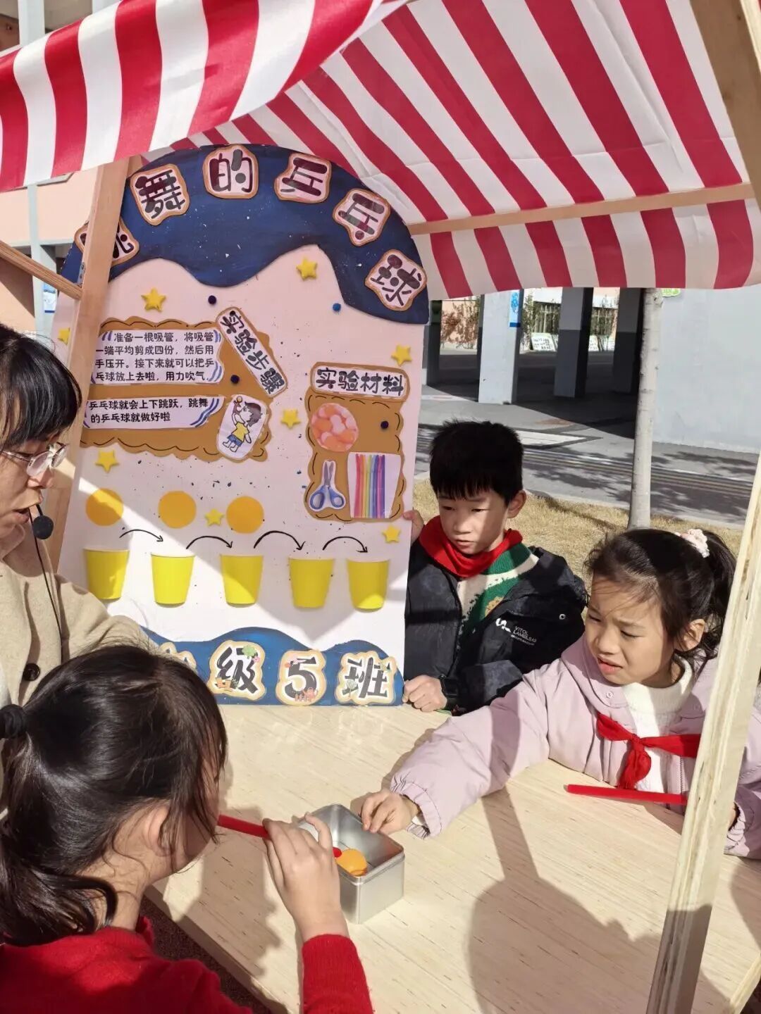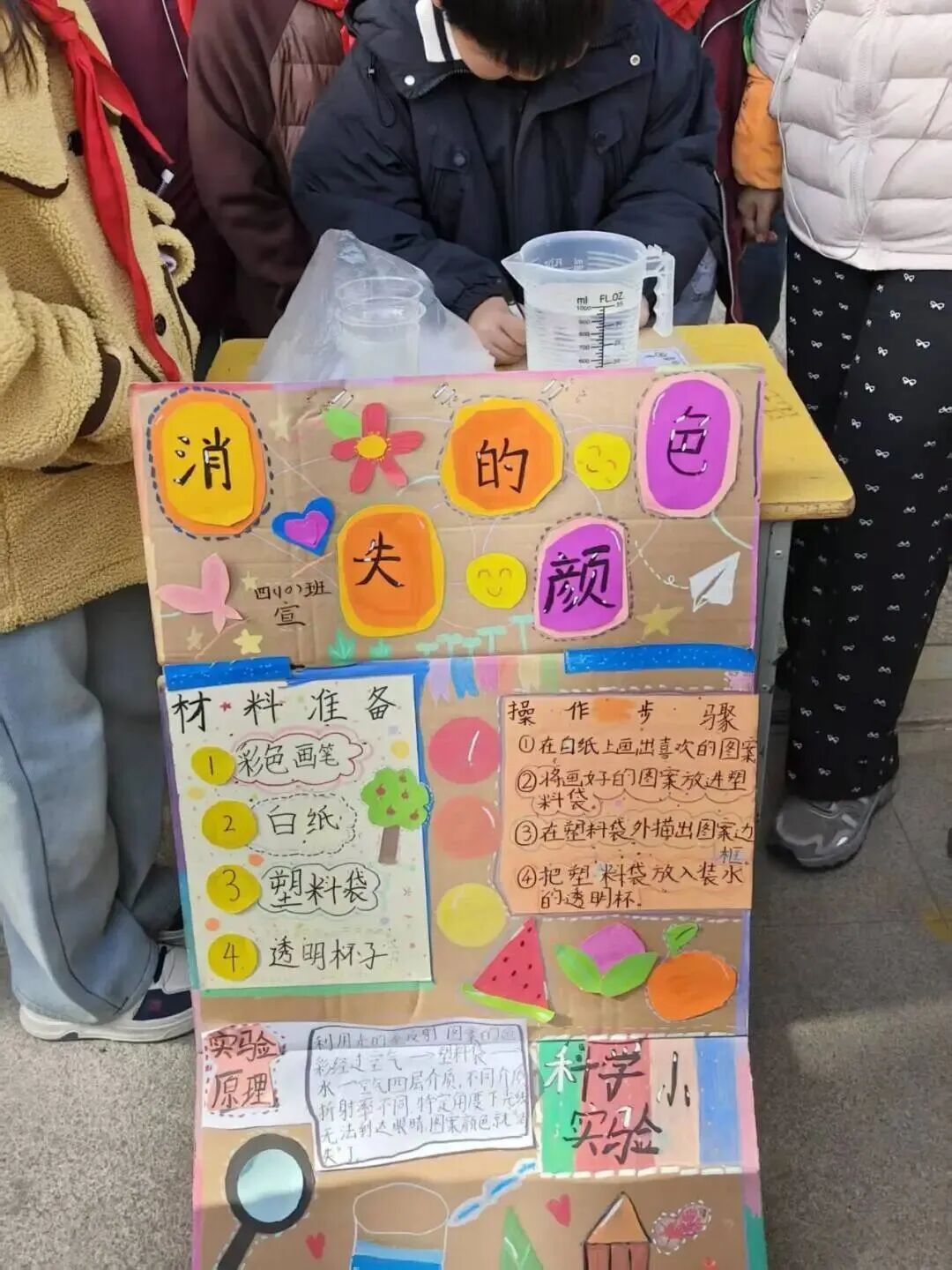 科技游园会时段,各年级分批次沉浸于充满趣味的科学乐园。三四年级搭建的实验摊位前挤满了前来挑战的小小“探索者”:有同学在“逃跑的牙签”实验摊位前屏息凝神,看着沾了洗洁精的牙签在水面迅速游动;有同学围观的“会跳舞的豆子”在醋与苏打的融合中上下翻飞,演绎着酸碱反应的活泼姿态;有同学则以“泼水成画”探索流体动力学与色彩的交融,在水墨晕染间感受科学之美……各个摊位前排起长龙,孩子们在亲手操作中体验科学原理,每一次成功的实验都引来阵阵欢呼。