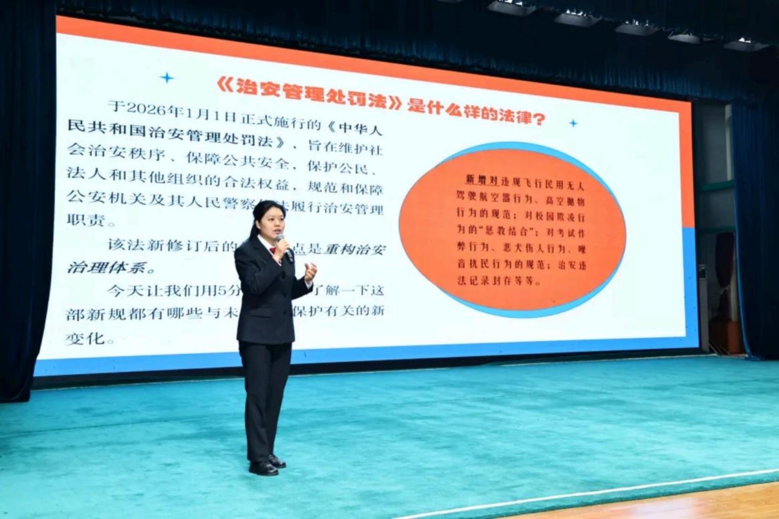 本次开学典礼紧扣未成年人思想道德建设要求,以2026年1月1日修订施行的《中华人民共和国治安管理处罚法》为契机,精心设计“法治护航  阳光成长”“知法明理  少年有责”“崇法 向善携手同行”三个篇章,层层递进、由知到行,引导学生树立法治意识,扣好人生第一粒扣子。