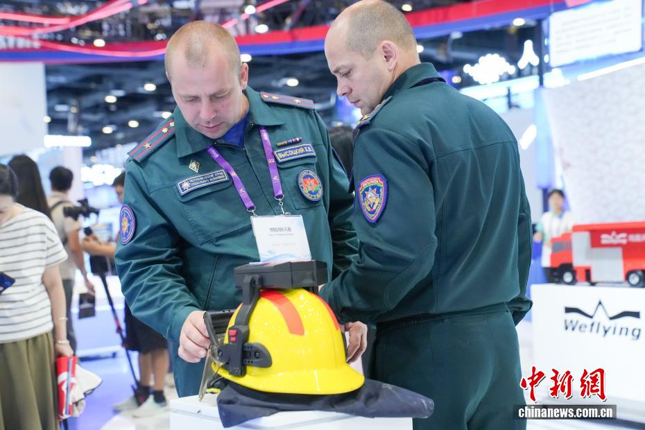 9月17日,正在广西南宁举行的第22届中国—东盟博览会现场,展出的不少先进科技产品成为场上的焦点。图为参会者仔细观察一个智能消防头盔。