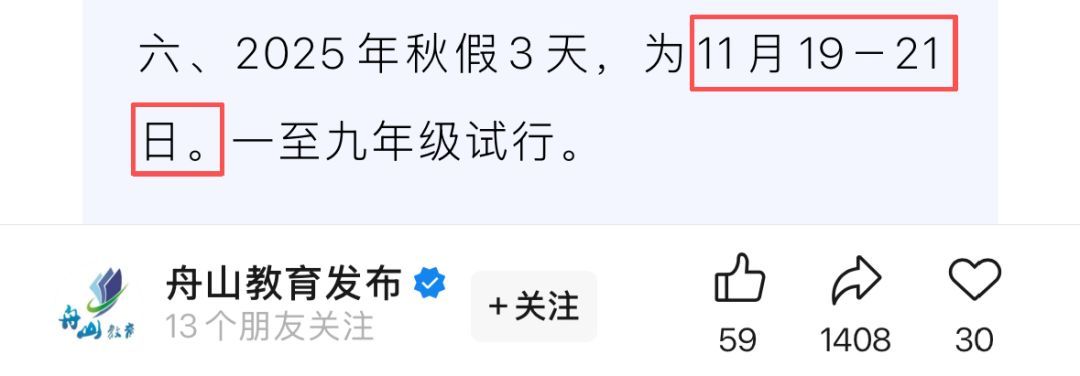 舟山市,已率先确定秋假时间安排在11月19-21日。