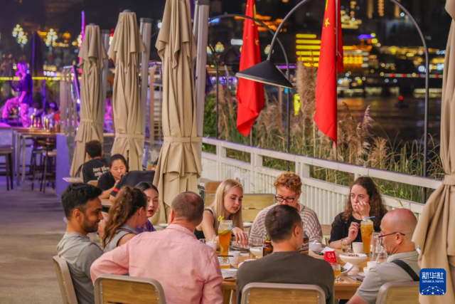 9月30日,外国游客在重庆市南岸区南滨路品尝重庆美食、欣赏夜景。