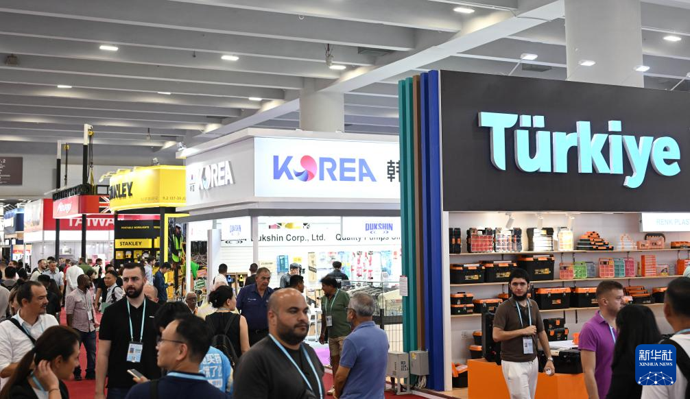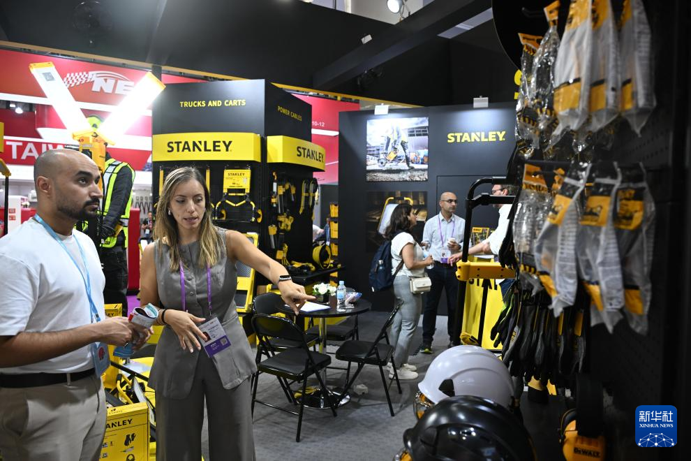 10月15日,在广交会进口展区,境外采购商(左)在美国公司史丹利展区参观。