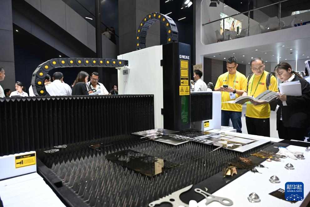 10月15日,境外采购商在激光切割机展台前洽谈。
