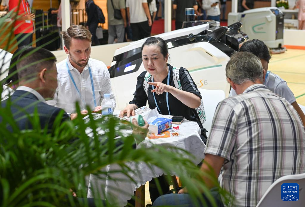10月15日,展商在杜尼移动机器人展台和客商交流。