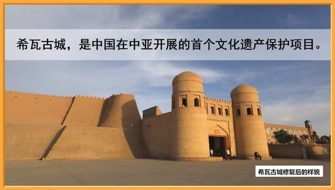 2014年,中乌双方决定合作修复希瓦古城。希瓦古城,是中国在中亚开展的首个文化遗产保护项目。2014年施工,2019年竣工,为期6年的中乌合作,让希瓦古城又焕发出新的生机与活力。2022年,习爷爷第三次访问乌兹别克斯坦时,赠送给当地领导人一件特殊的国礼。它就是中乌合作修复的希瓦古城微缩模型。一件国礼,体现出两国领导人对文明交流的重视。一座古城,谱写出中国构建人类命运共同体的文明乐章。