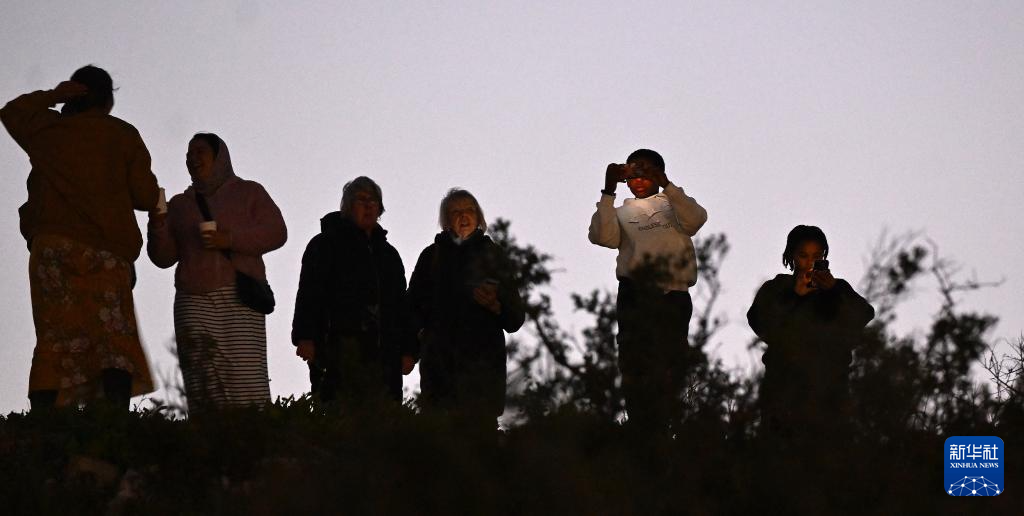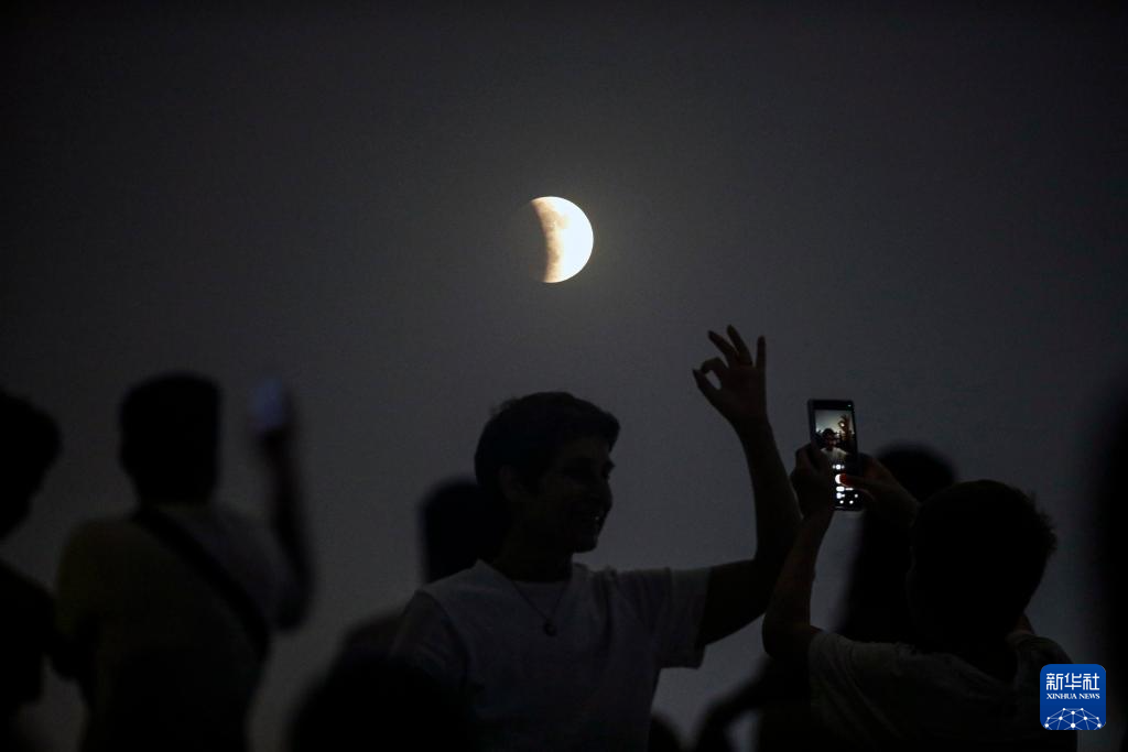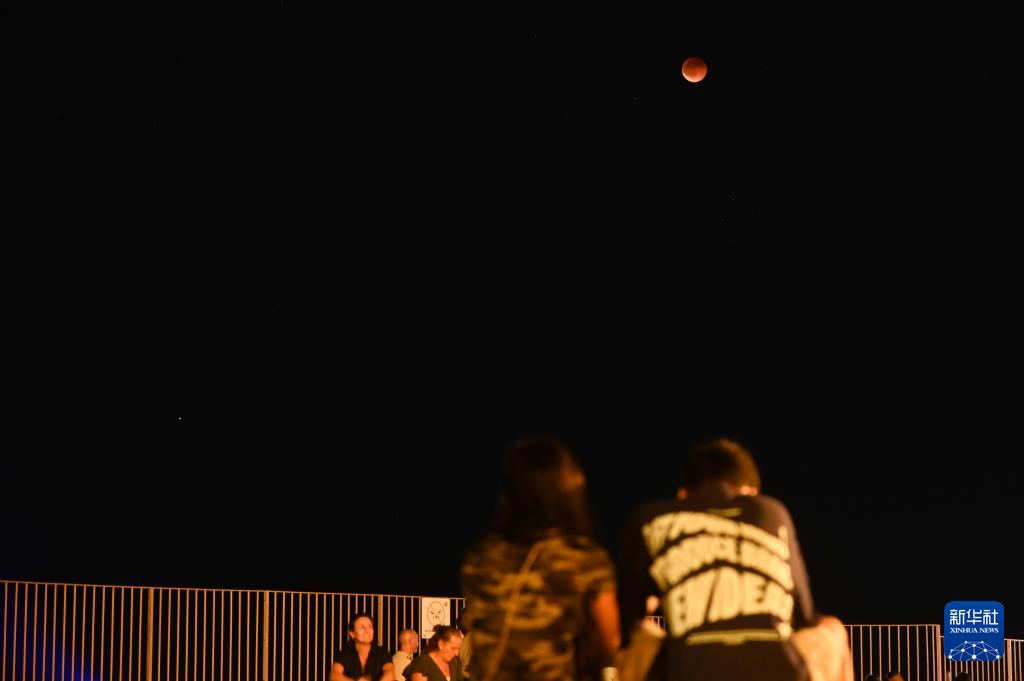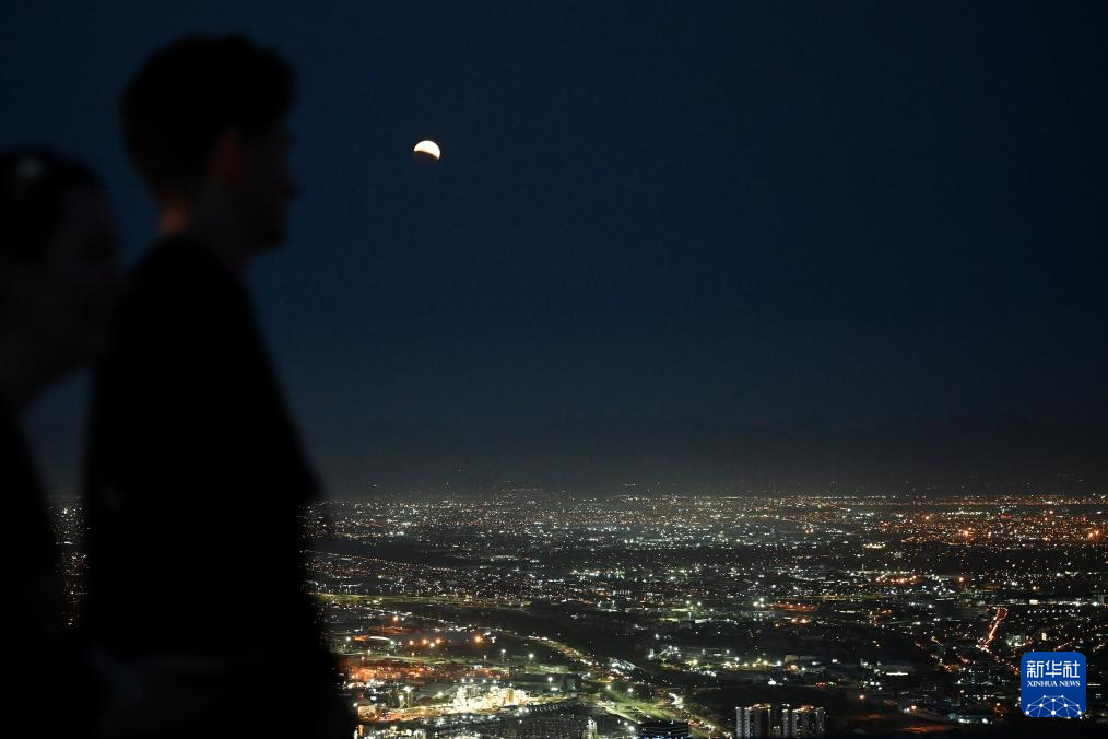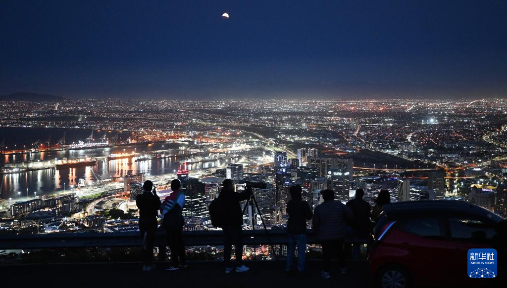 9月7日,在南非开普敦,人们观看城市夜空中的月食。
