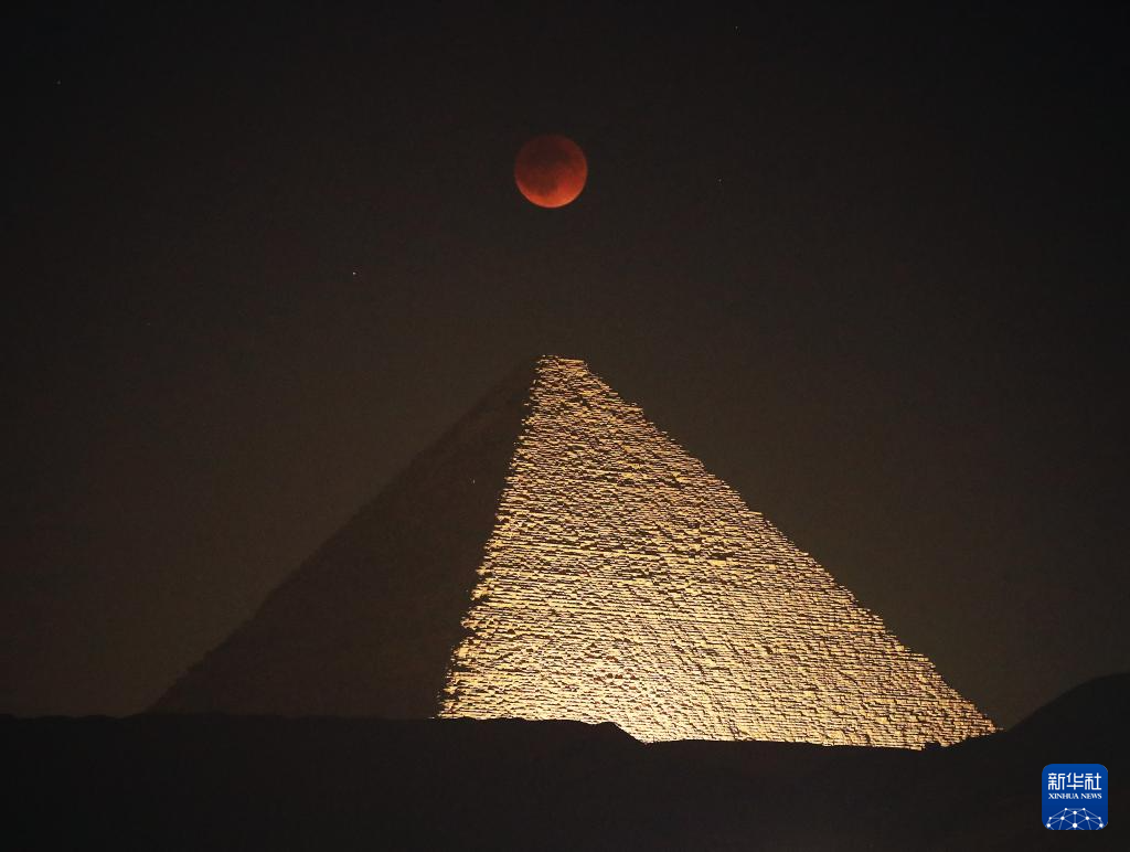 这是9月7日在埃及吉萨拍摄的胡夫金字塔上空的月食景象(二次曝光)。