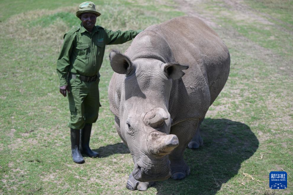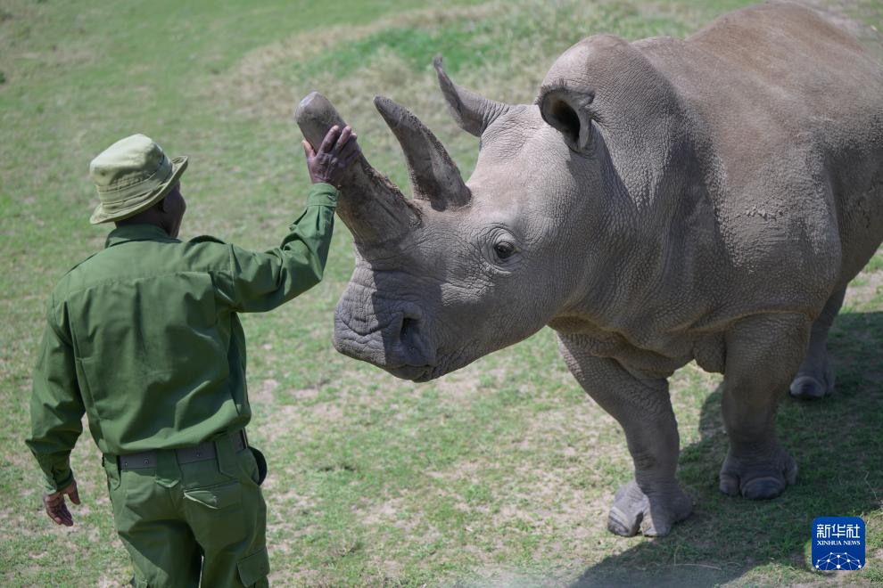 10月7日,在肯尼亚中部莱基皮亚郡奥尔佩杰塔自然保护区,工作人员与雌性北方白犀牛“法图”互动。