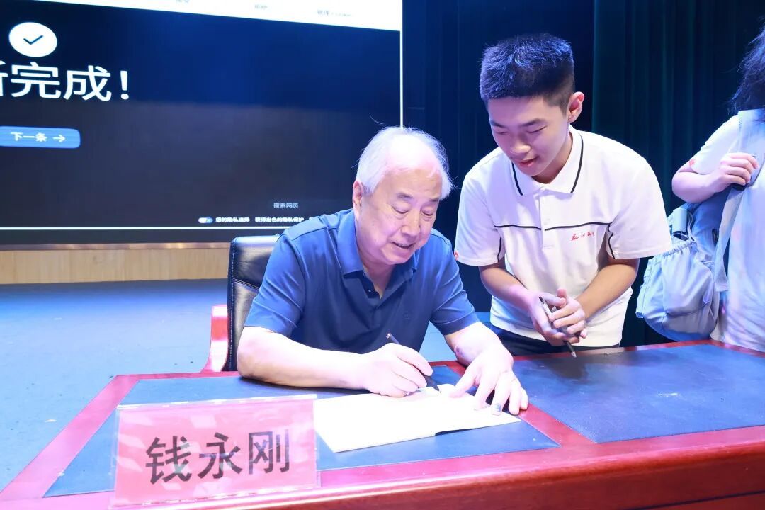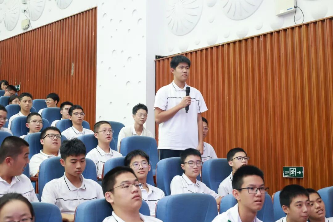 钱永刚教授强调:“教育的根本是培养仰望星空、心怀家国的人,要让学子传承老一辈科学家的报国志,把个人理想融入国家发展。” 这一教育理念也与泉州五中“钱学森班”的培养目标不谋而合。在互动环节,学生们踊跃提问,与钱教授进行了面对面的交流。面对学生提出的“AI时代,我们要如何保持创新力”等问题,钱教授耐心细致地一一解答,给学生提出宝贵的建议和鼓励。现场气氛热烈,智慧火花不断碰撞。