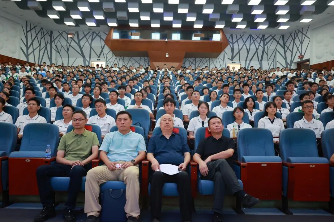 在授旗仪式后,钱永刚教授为高一年级全体师生带来了一场意义深远的专题讲座。钱永刚教授以“打造国之重器,铸造科技丰碑”为题,深情讲述了钱学森从海外归来,一句“中国人为什么不能搞导弹?”点燃了中国航天的星星之火。在国力薄弱、人才匮乏的年代,钱学森以超凡的远见推动“优先发展导弹”,打破“先航空后航天”的惯例,带领团队从零起步,铸就“两弹一星”的辉煌。他以“爱国、奉献、求真、创新”为核心,生动诠释了钱学森精神的内涵,鼓励五中学子树立远大理想,勇于探索未知。