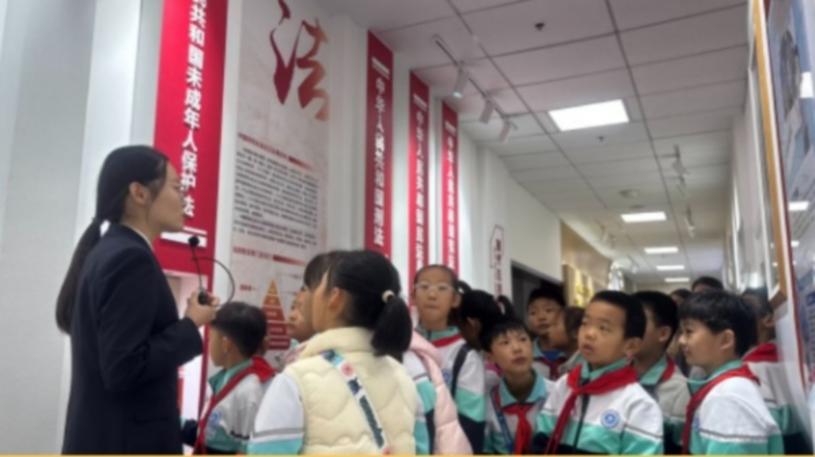 在检察干警的引导下,同学们走进未成年人检察中心,步入“时光长廊”,循着历史脉络感知中华法律文化的源远流长与现代法治文明的蓬勃发展。干警们以通俗语言阐释专业概念,用鲜活案例串联古今法律变迁,使抽象的法治知识在历史与现实的交汇中变得可感可知,为学生筑牢法治认知的第一块基石。