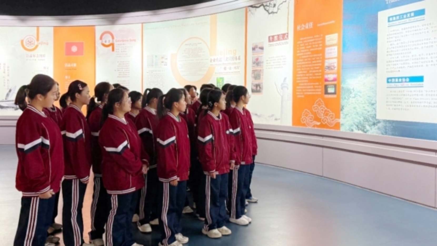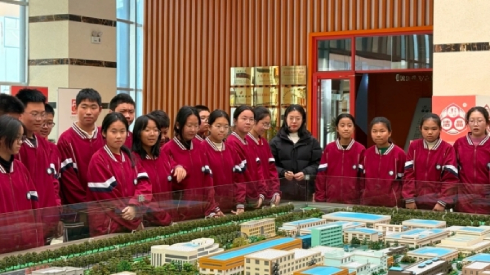 同学们首先聚焦企业展厅内的园区模型,直观了解集团的产业布局。在企业理念墙前,大家认真聆听讲解员介绍“以人为本、诚信互利”等发展理念,对洁晶集团的企业文化有了初步认知。