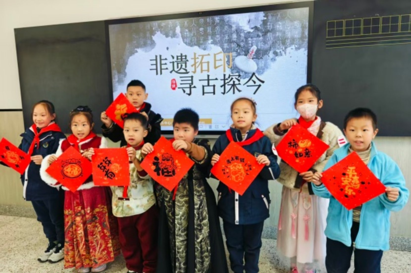与此同时,各班级教室化身为热气弥漫的“民俗工坊”。孩子们挽起袖子,和面、调馅、包饺搓汤圆,在劳动协作中体味“冬至大如年”的团圆暖意。一旁的非遗拓印区域则安静专注,墨香与纸韵间,古老的图案徐徐浮现于掌心。