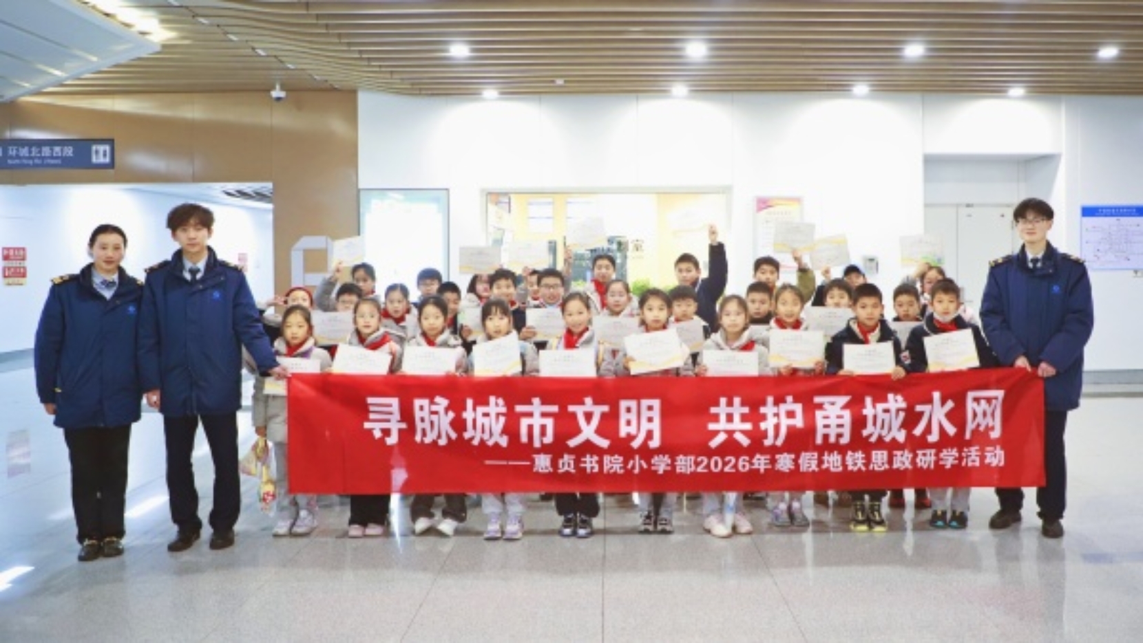 寒假伊始,宁波市惠贞书院(小学部)30名学子踏上了一场别开生面的城市研学之旅。同学们围绕“寻脉城市文明,共护甬城水网”主题,先后探访地铁7号线湾头站与姚江大闸水情教育基地,通过实地参访与深度体验,系统认知了支撑现代城市高效运转的公共交通与城市发展水利工程两大核心系统。
