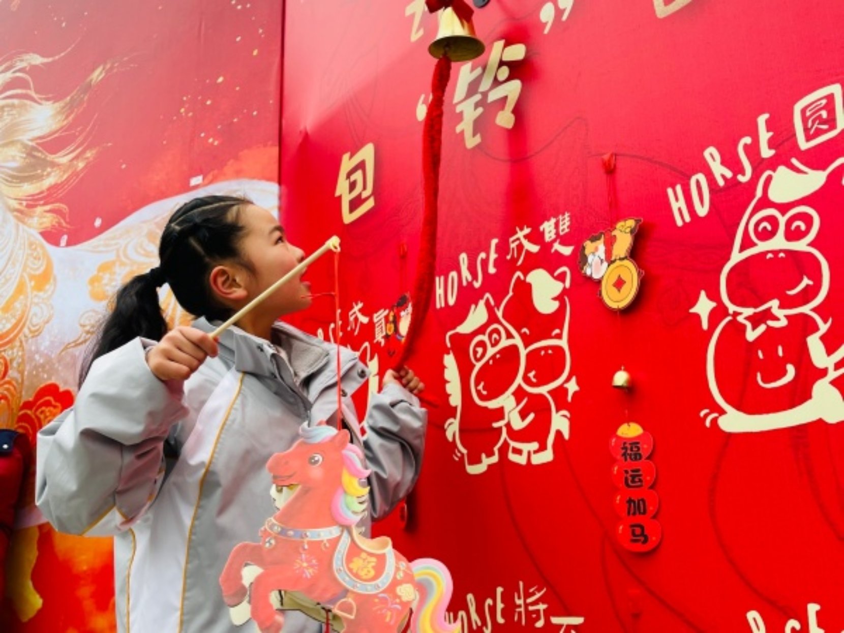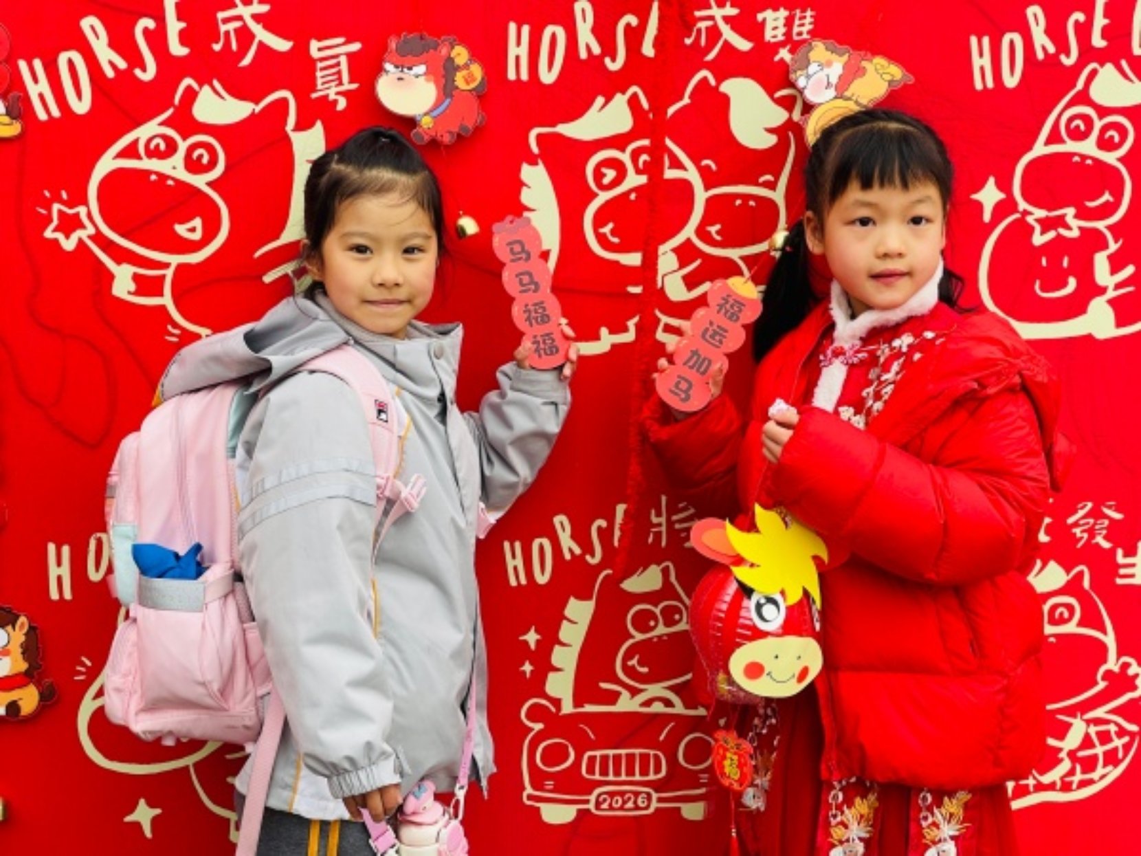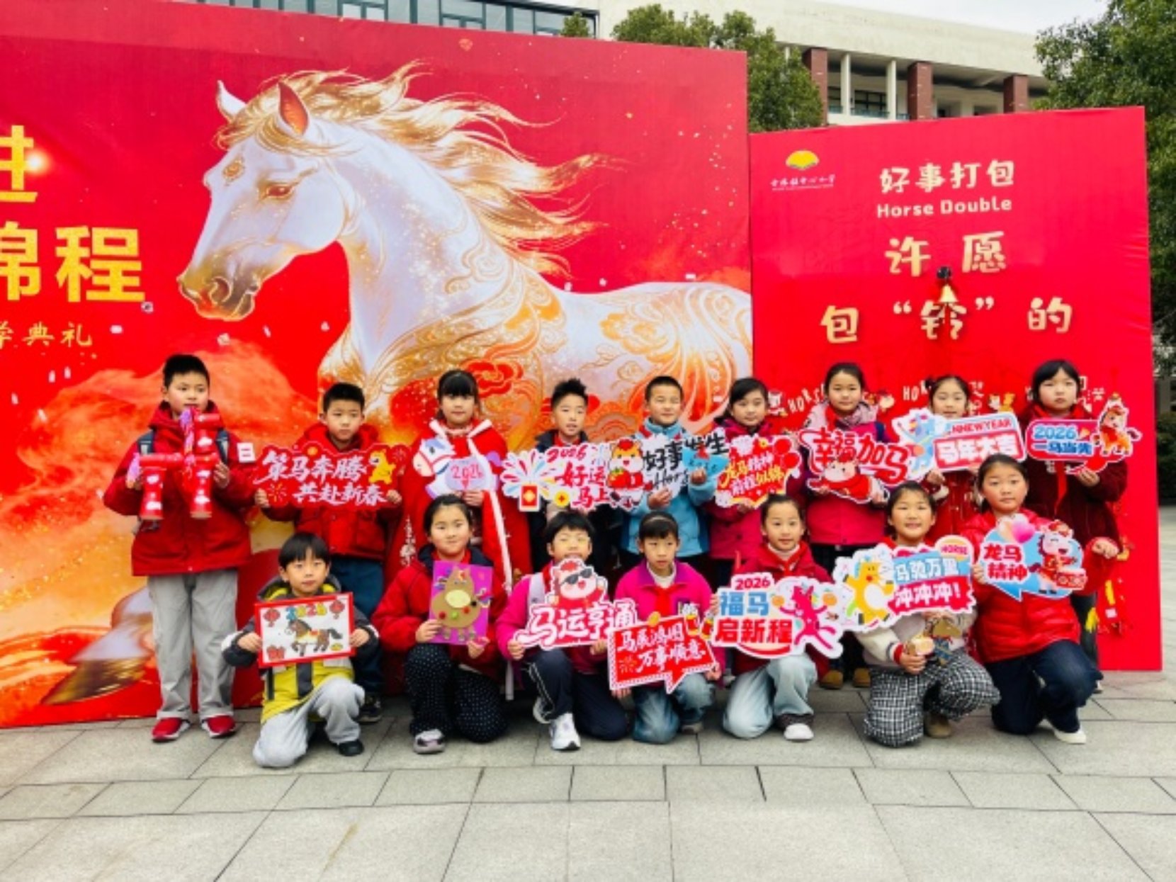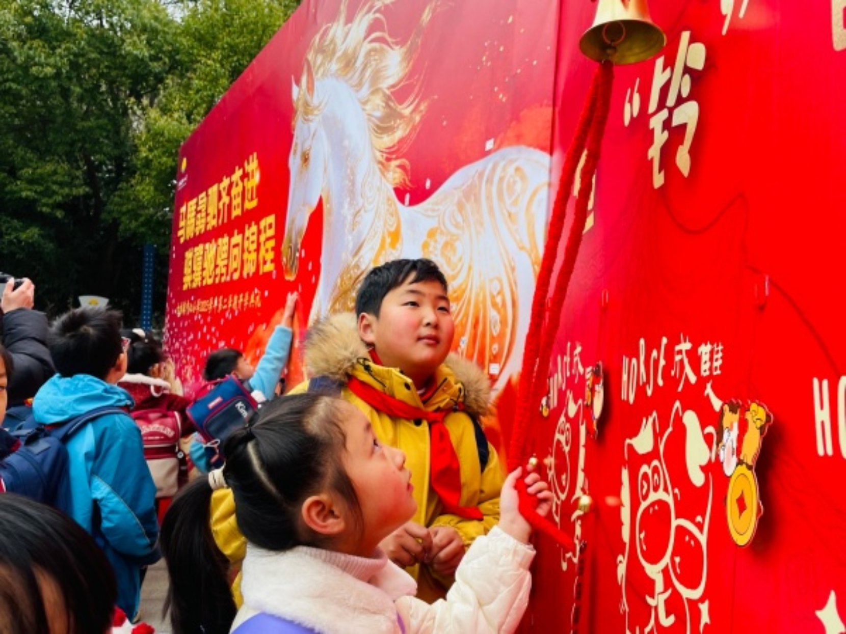晨光熹微中,校园里已是一派热闹景象。古小娃们有序入校,在小礼仪的贴心引导下,纷纷选取心仪的 “小马好运贴”,认真粘贴到大雅石前的大海报上。一枚枚精致的贴纸,汇聚成一幅朝气蓬勃的 “千骏图”,定格下孩子们对新学期的美好期许。孩子们还亲手立下新学期的目标与心愿,轻轻摇动 “福铃”,清脆的铃声里,满是 “好运降临、马上就灵” 的美好祈愿,为新学期拉开了充满仪式感的序幕。