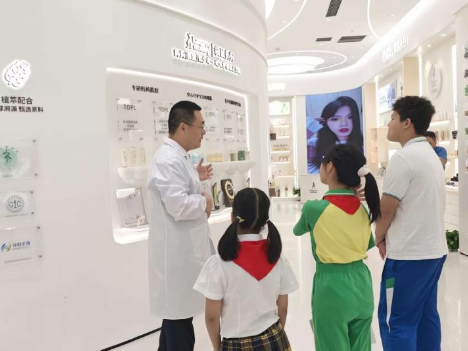 接着,我们在袋鼠妈妈集团首席科学官严老师的带领下,参观了品牌馆。哇,这里有好多给婴儿、青少年和妈妈使用的护肤品,比如洗面奶、洗发水、沐浴露等等。严老师说,这些产品特别讲究“妆食同源”,像是小麦、燕窝、橄榄这些日常能吃的食品,把它们做成成分精粹用在护肤品里,这让我感到非常新奇和放心。