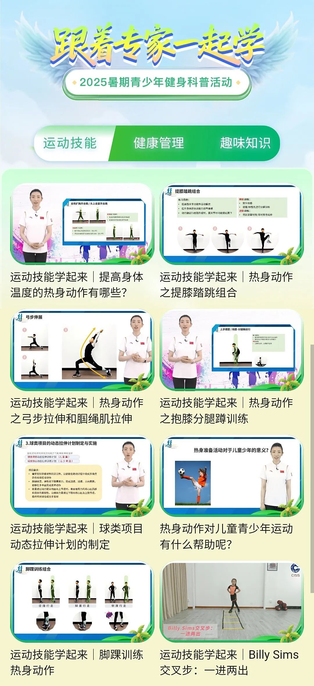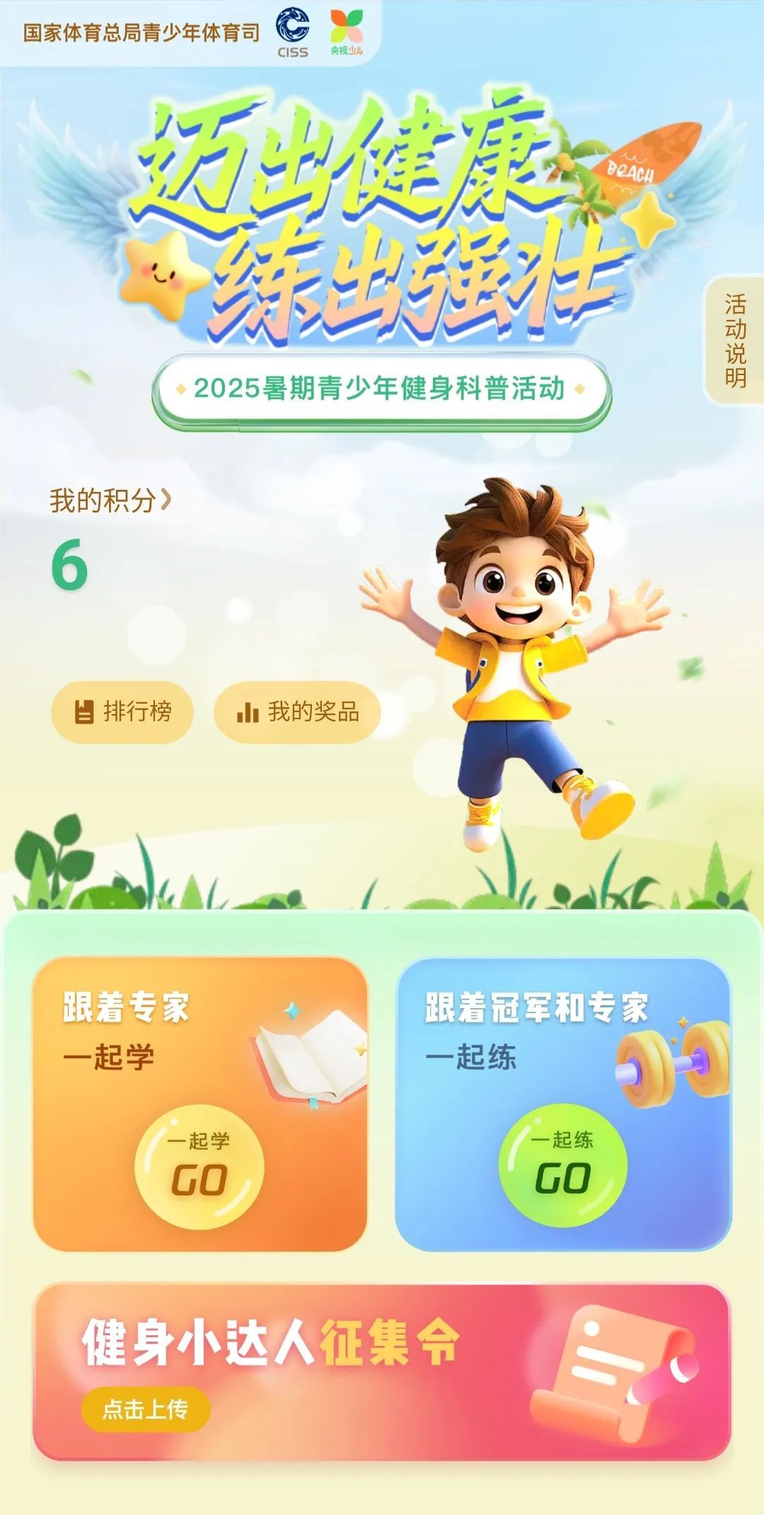 暑假不虚度,运动正当时!8月8日我国第17个“全民健身日”之际,由国家体育总局主办、国家体育总局体育科学研究所承办的“迈出健康,练出强壮”2025暑期青少年健身科普活动,将在央视少儿客户端正式上线!