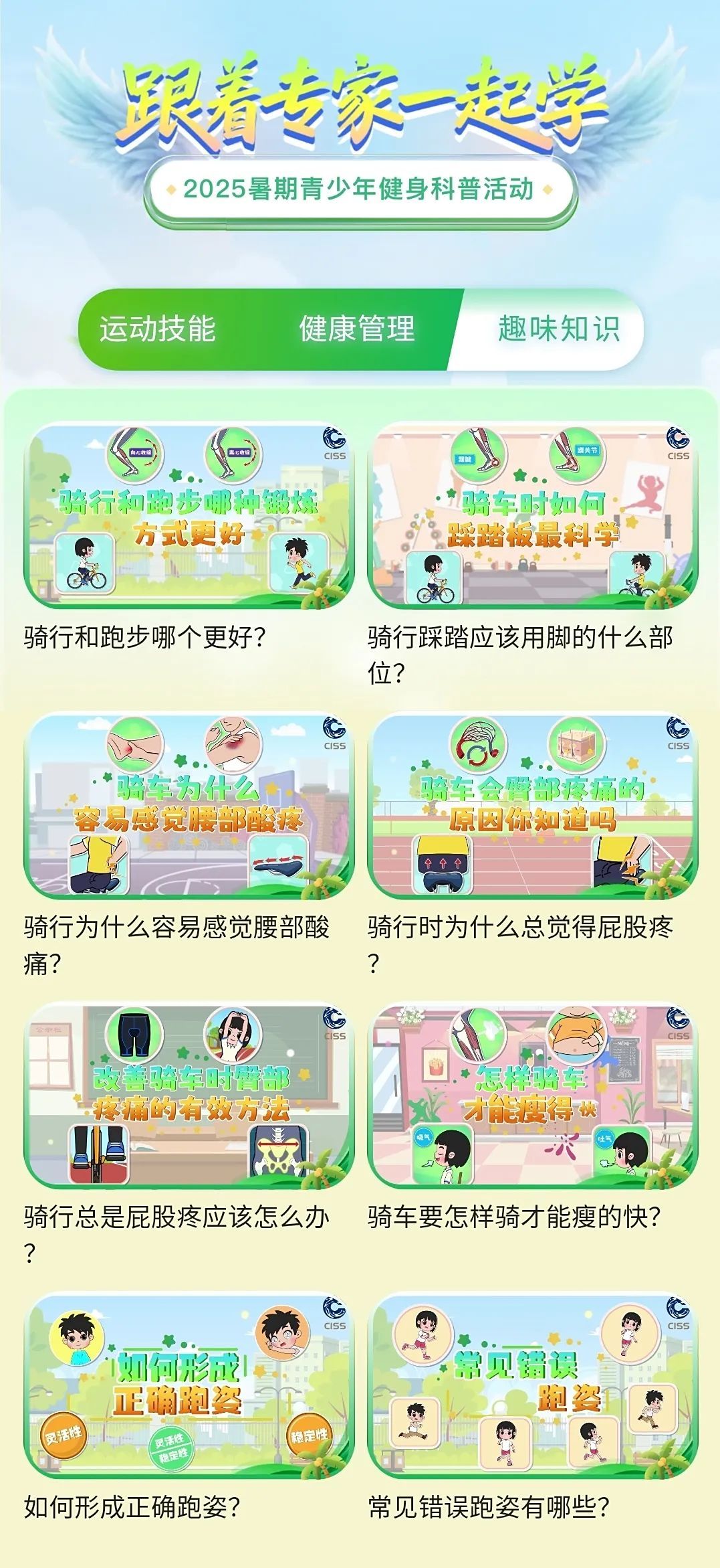 想运动却怕方法不对?活动里的“跟着专家一起学”就是为了帮大家解决这个难题。运动技能、健康管理、趣味知识三大垂类,每天更新精选科普视频,从运动前的准备动作、跑步技巧,到近视防控、脊柱健康,再到 “天天跑步好还是隔天跑步好”“骑车要怎样骑才能瘦下去”这类同学们好奇的问题,专家都会给出专业解答。完整观看视频就能拿积分,转发分享还能额外加分,边学边积累,健康知识轻松掌握。