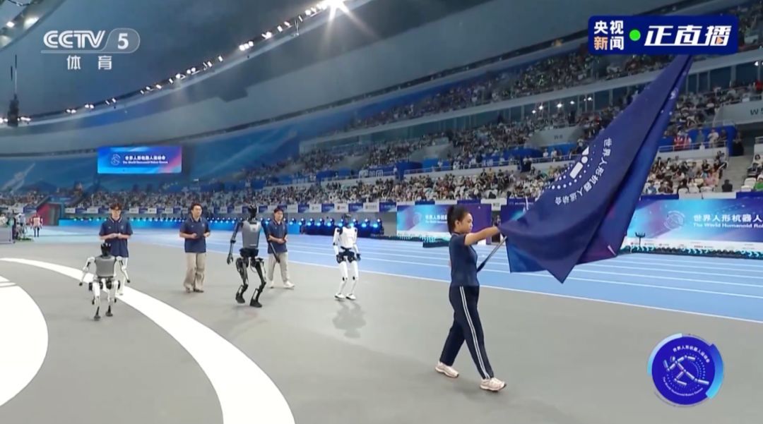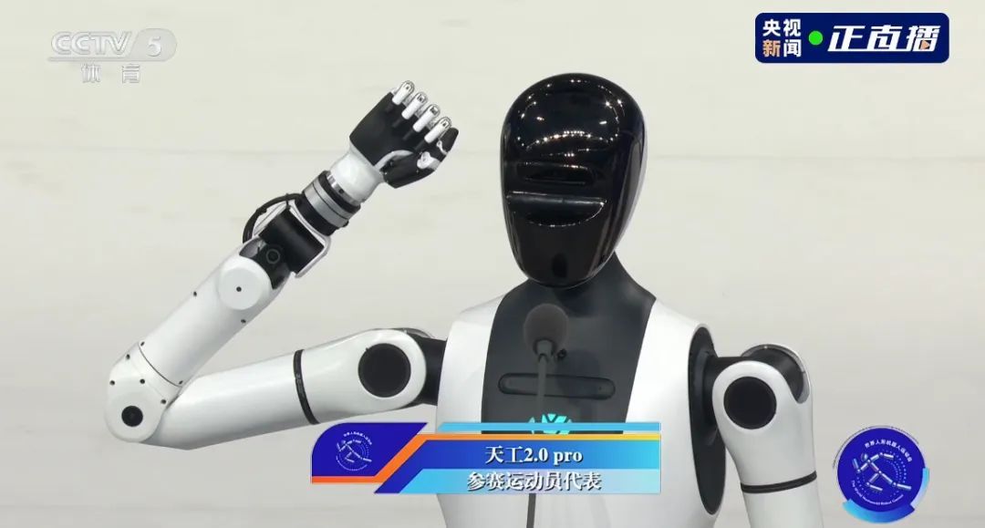 参赛选手宣誓环节,全球首个机器人运动员代表天工2.0 pro庄严宣誓。